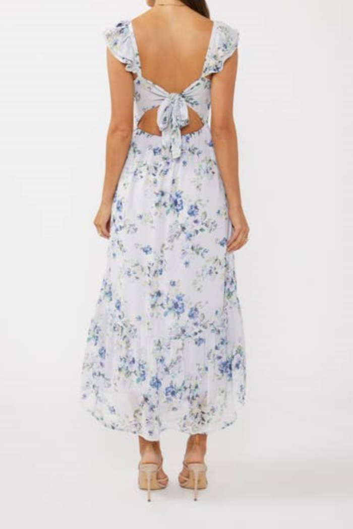 Embrace effortless elegance with the Open Back Tie Maxi Dress, crafted from floral chiffon, perfect for spring. Featuring a scoop neckline, ruffle sleeve hems, a tiered skirt with a high/low hemline, elastic back waist tunnel, and elegant back ties, this dress offers a flattering fit with a 50-denier skirt lining for comfort and coverage.