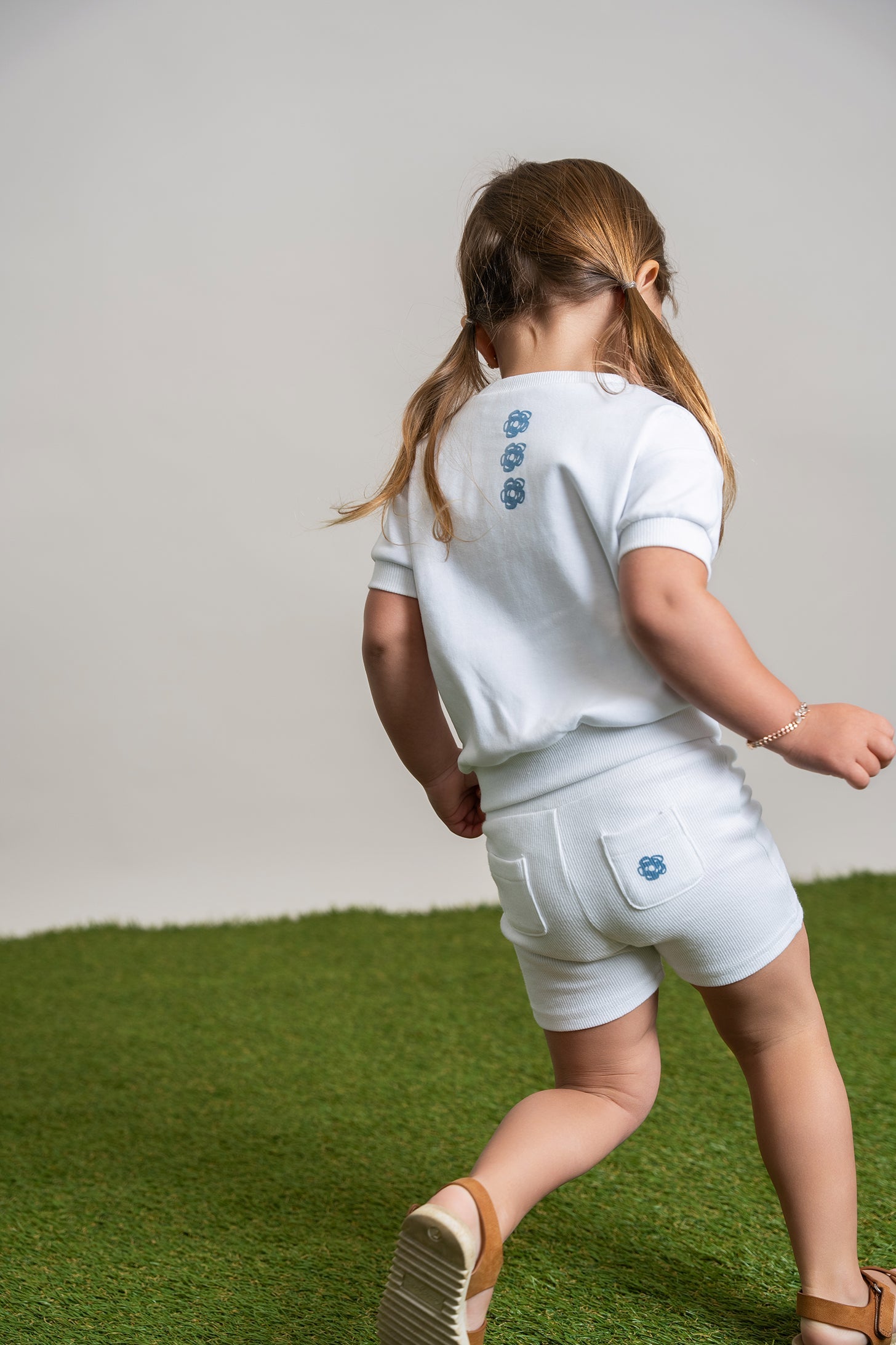 Baby girls fine rib 2 piece set. Short sleeve top with flower print at front chest and back. Matching shorts with covered elastic waistband and back pockets.ֲ