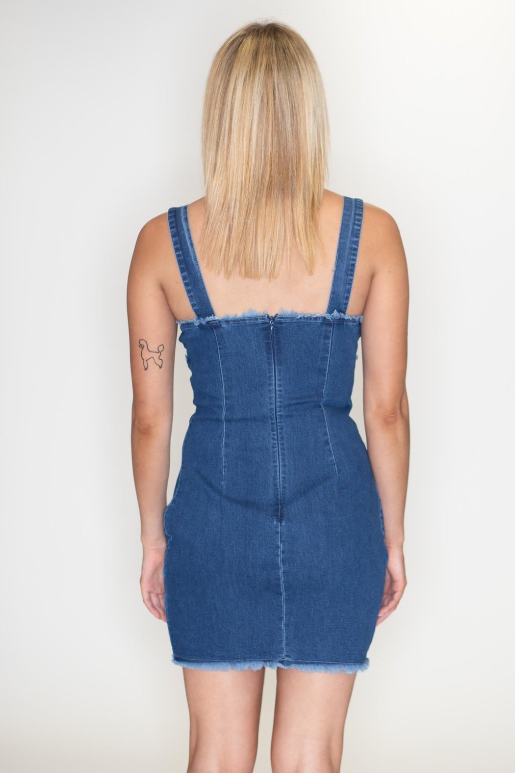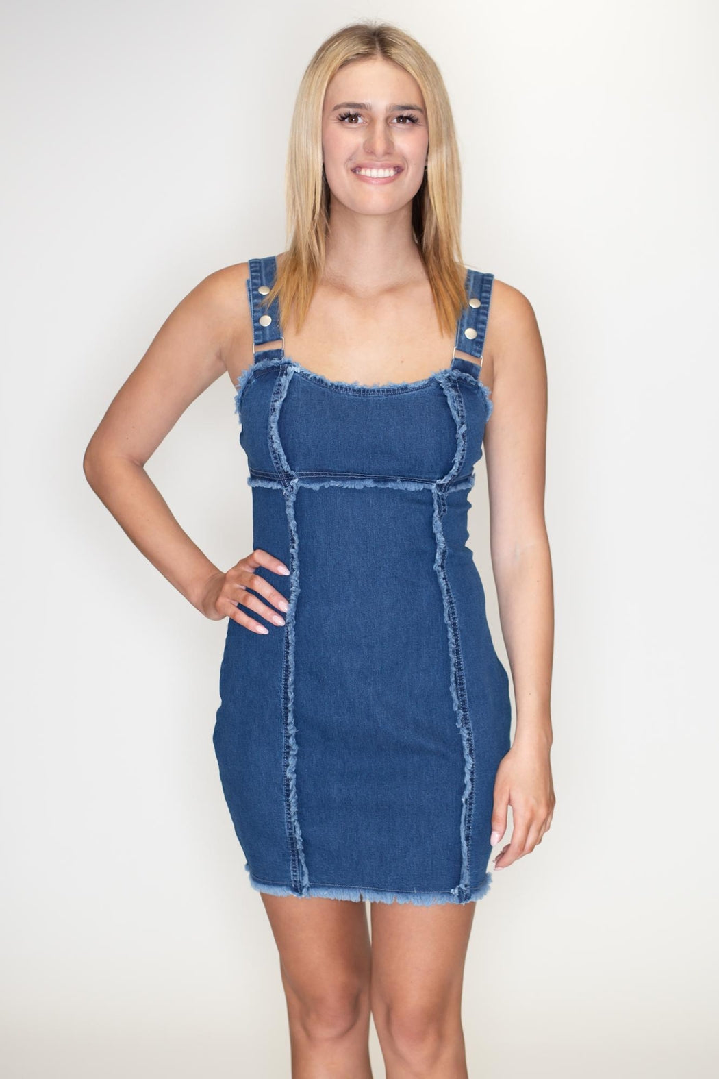 Frayed hem denim dress with adjustable snap straps and back zipper closure.