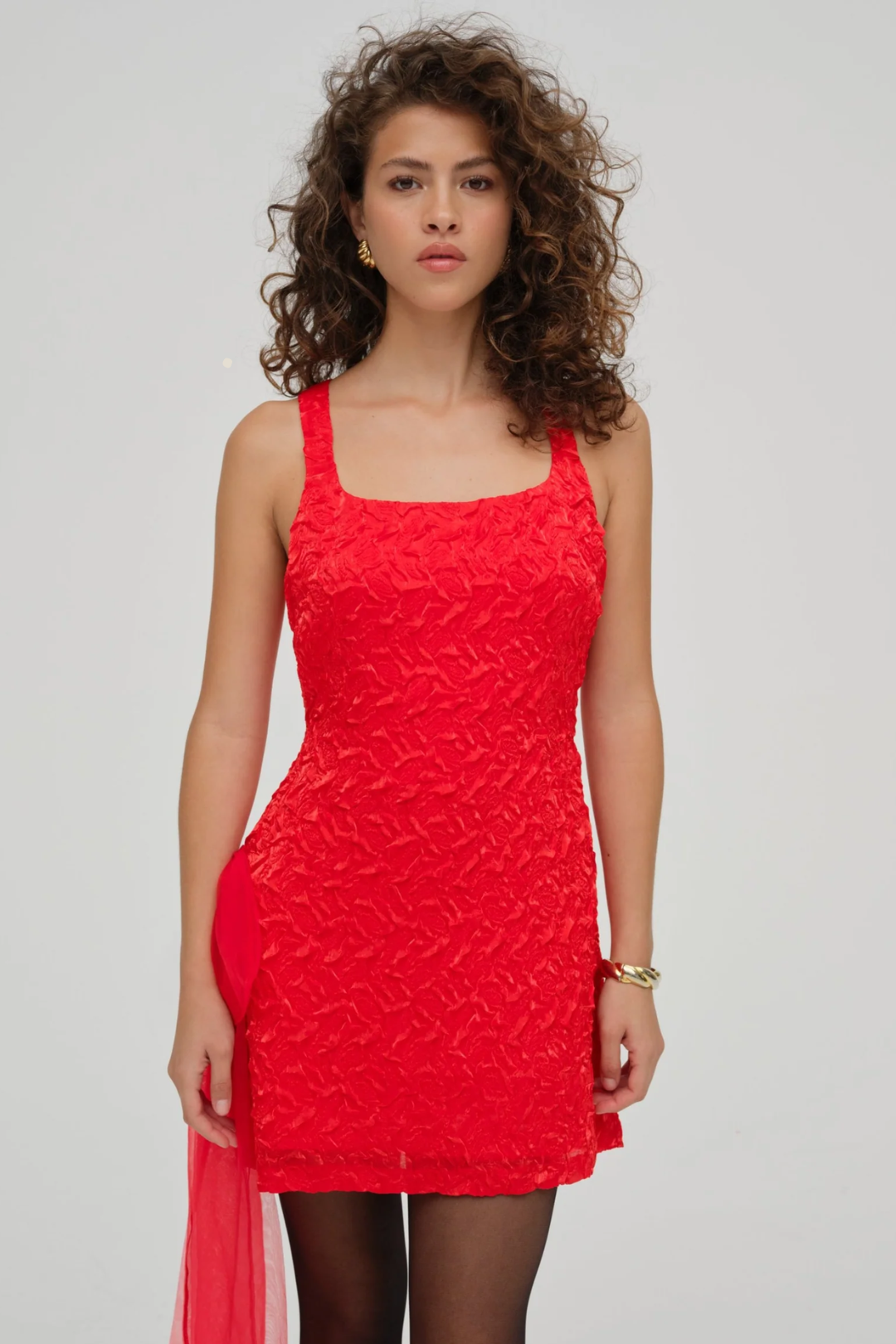 This season, prepare for a glamorous night with the striking Frosted Organza Mini Dress. Designed with an oversized soft tulle bow at the hip, this dress has a square neckline, a functional covered button at the center-back neckline, and is crafted from a textured fabric. Perfect for holiday parties, romantic evenings, or girls' nights out.