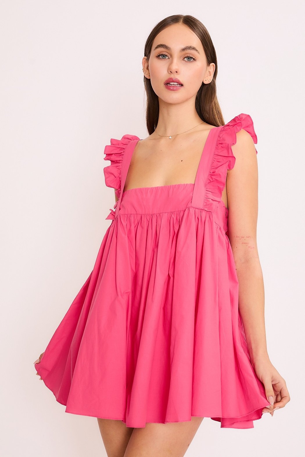 This vibrant fuchsia babydoll dress is a playful and chic statement piece. Featuring wide, ruffled straps and a square neckline, it has a flattering, loose silhouette that flares out for a flowy, airy fit. The ruffled detailing along the straps adds a feminine touch, while the bright fuchsia color makes it perfect for standing out on any occasion. Its lightweight and breezy design makes it ideal for warm weather or a stylish, casual outing. Pair with your favorite sandals or heels for a complete look.