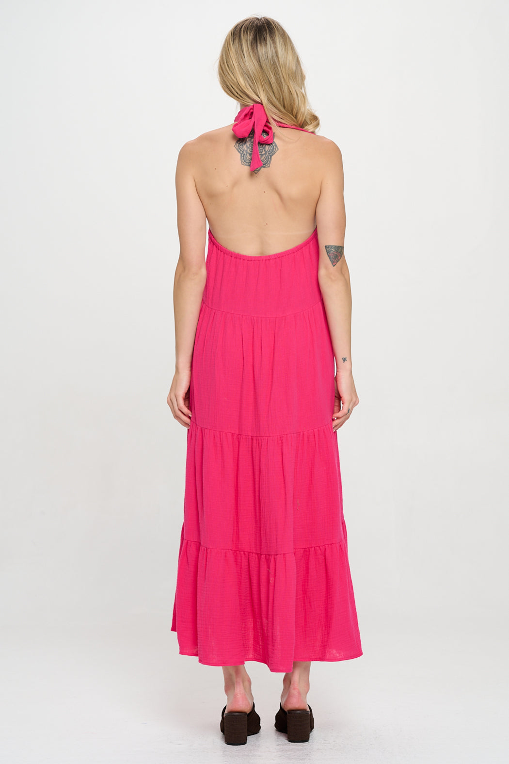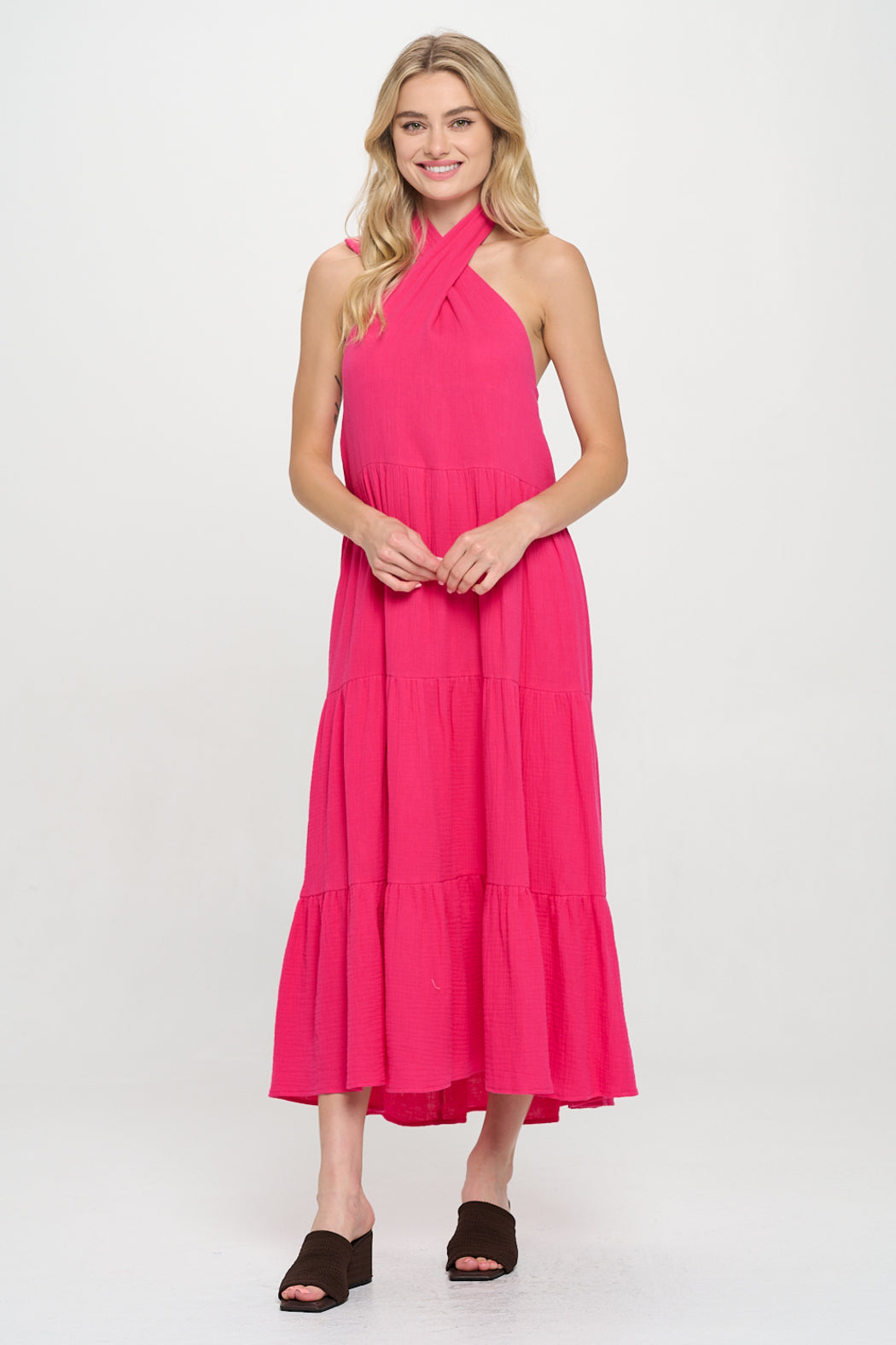 Make an entrance in the Fuchsia Island Halter Maxi Dress, a bold yet breezy statement piece perfect for your next warm-weather escape. Featuring a twisted halter neckline and a flowing tiered silhouette, this dress delivers both comfort and style in equal measure. The back tie closure ensures a flattering fit, while the vibrant hue captures the spirit of tropical getaways. Pair it with strappy sandals and oversized sunglasses for a look that’s ready for any sun-drenched adventure.