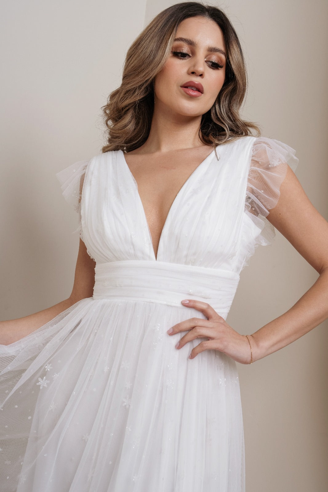 How cute is this glitter midi dress? It has a stunning low v-neckline with a cute flutter sleeve. It also has a wide waistband leading into a gorgeous a-line style skirt. It has the cutest glitter detail throughout the entire dress as well. This is such a cute dress for bridal showers, rehearsal dinners, bachelorette parties as well. The midi length is also super cute!