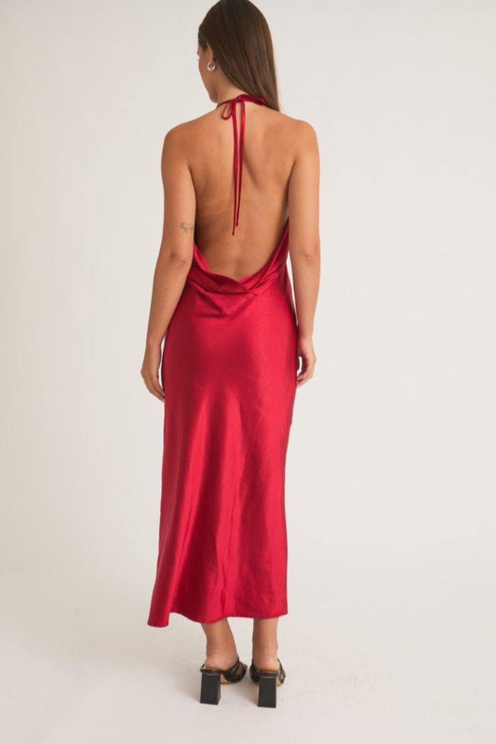 HALTER COWL NECK OPEN BACK SATIN MIDI DRESS