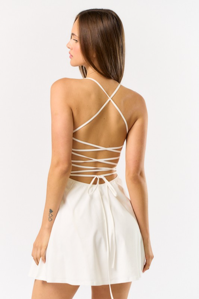 LACE UP CROSSED BACK A-LINE MINI DRESS