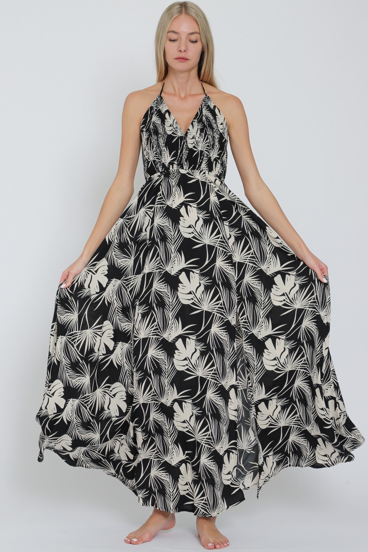 HALTER SMOCKED ELASTIC BACK WAISTED MAXI DRESS