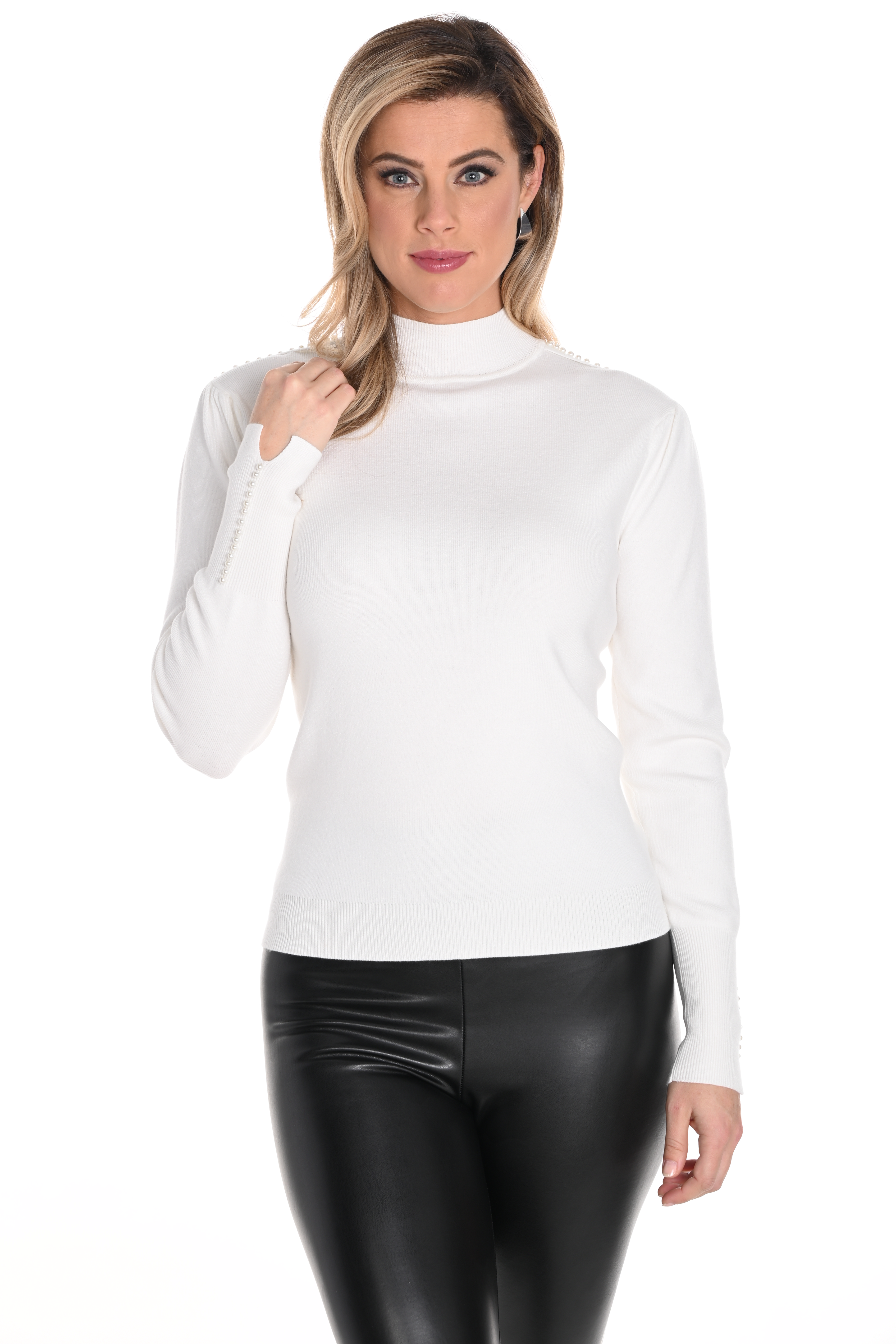 This Frank Lyman off-white mock turtleneck sweater exudes elegance with its delicate white pearl detailing. Its soft, comfortable fabric offers both warmth and style, perfect for cooler days. The timeless off-white color makes it a versatile wardrobe staple, easily paired with skirts or trousers. This sweater is ideal for adding a touch of sophistication to any outfit, whether casual or dressy.