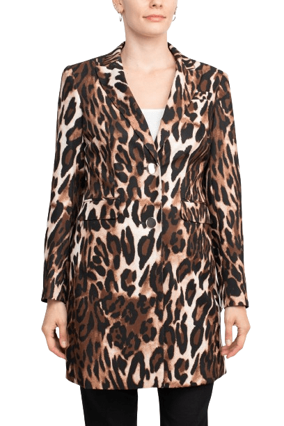 Crafted from high-quality stretch crepe fabric, the set offers a comfortable and flattering fit, allowing you to move with ease throughout your day. The long jacket features a notched collar and long sleeves, providing both warmth and elegance, while the leopard print adds a touch of boldness and personality.