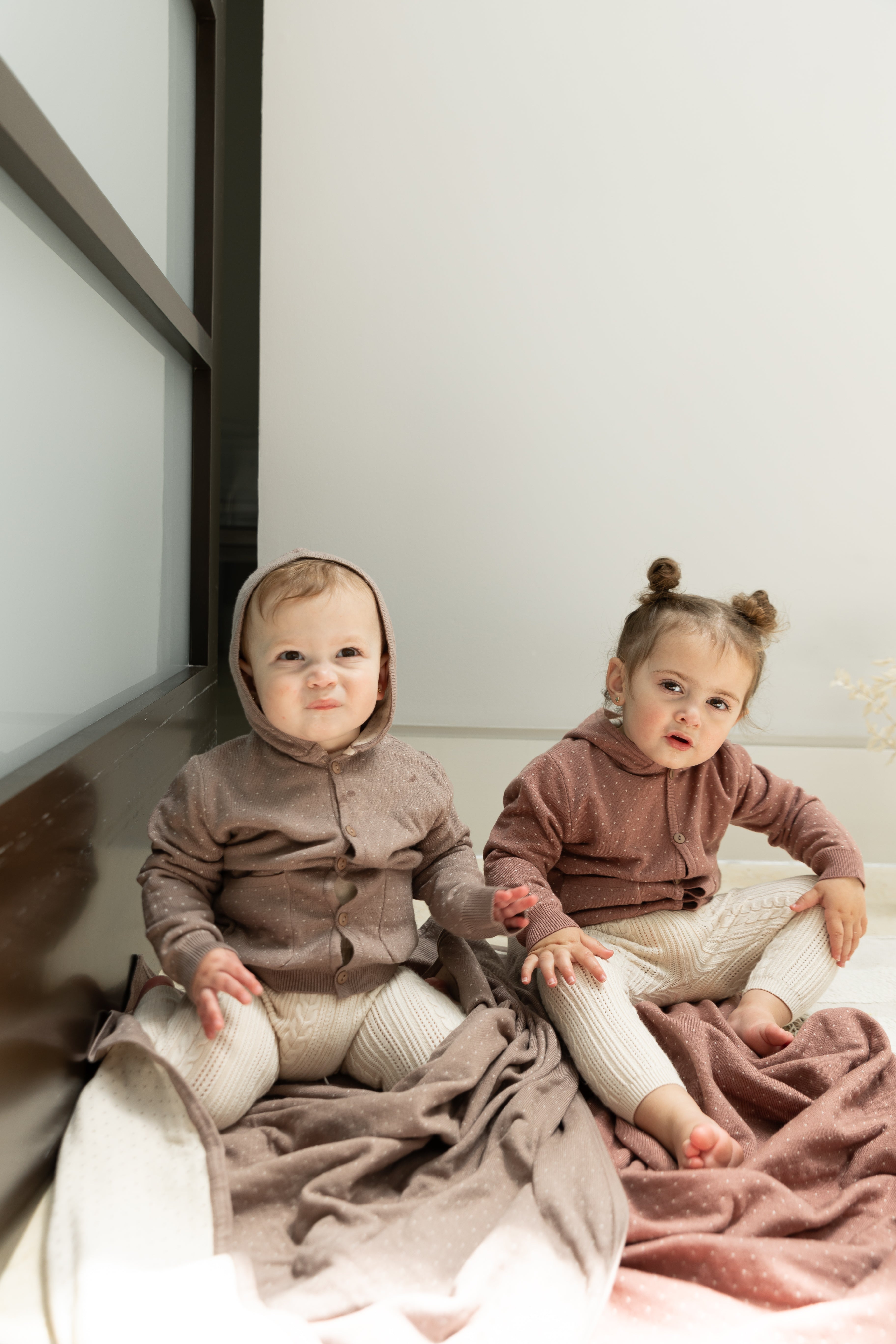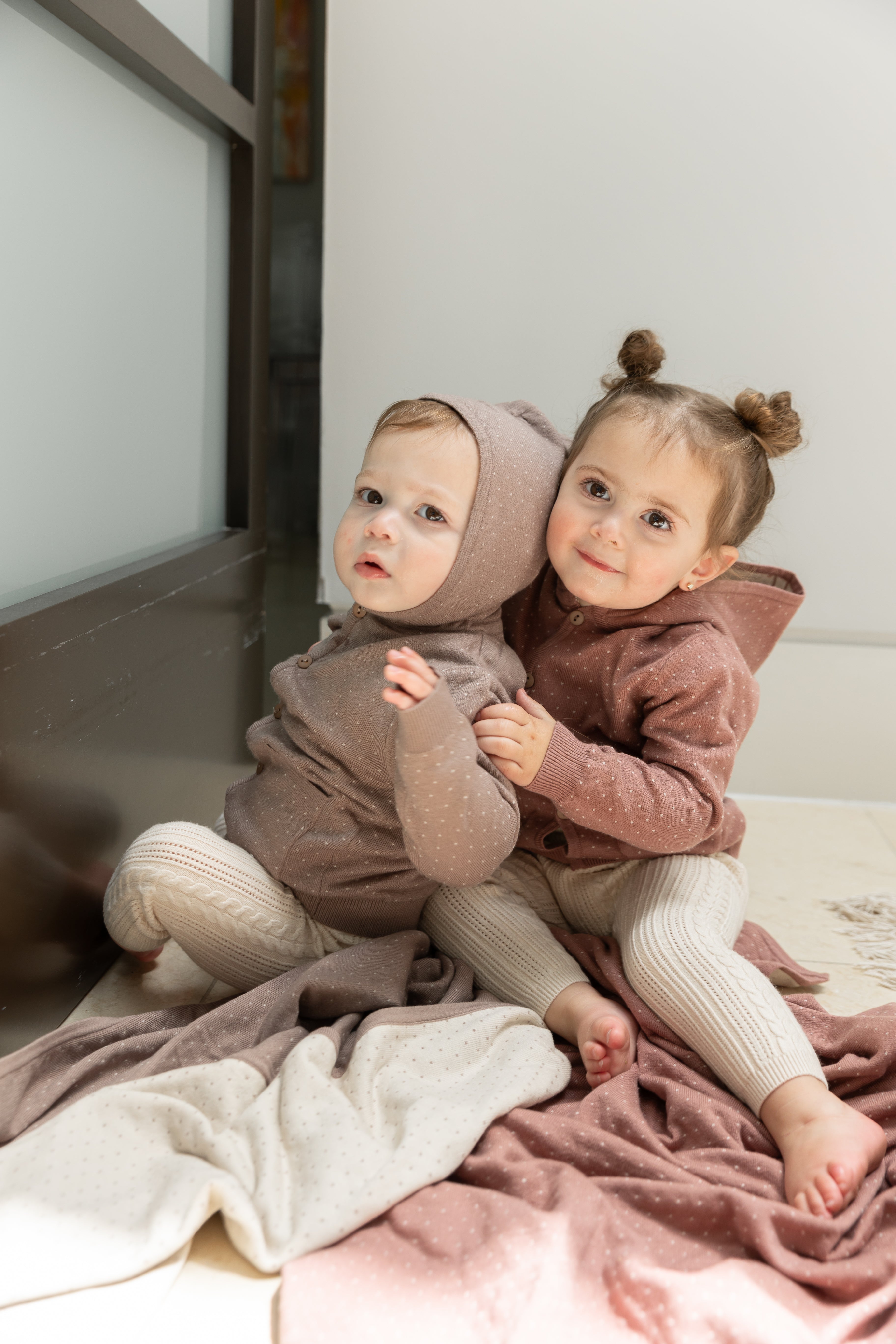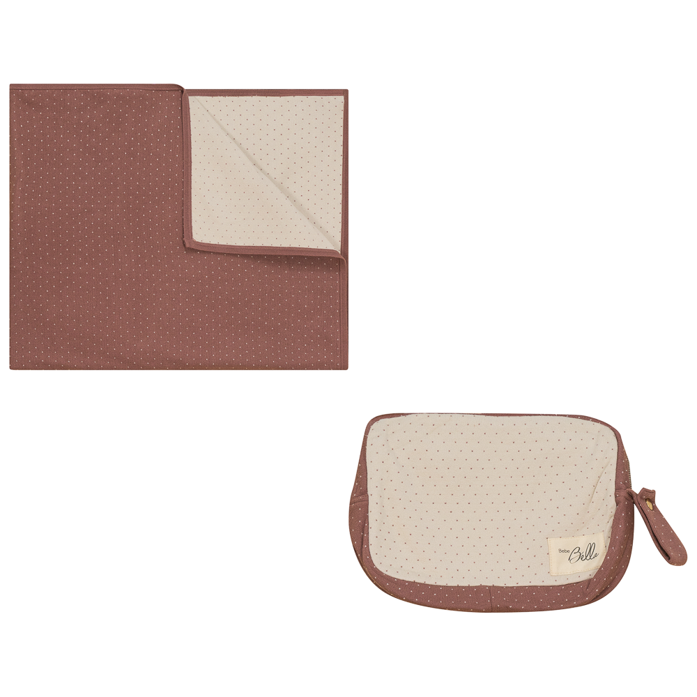 Baby boys and baby girls knitted blanket in matching pouch with dotted all over print and zipper on pouch opening. ֲ