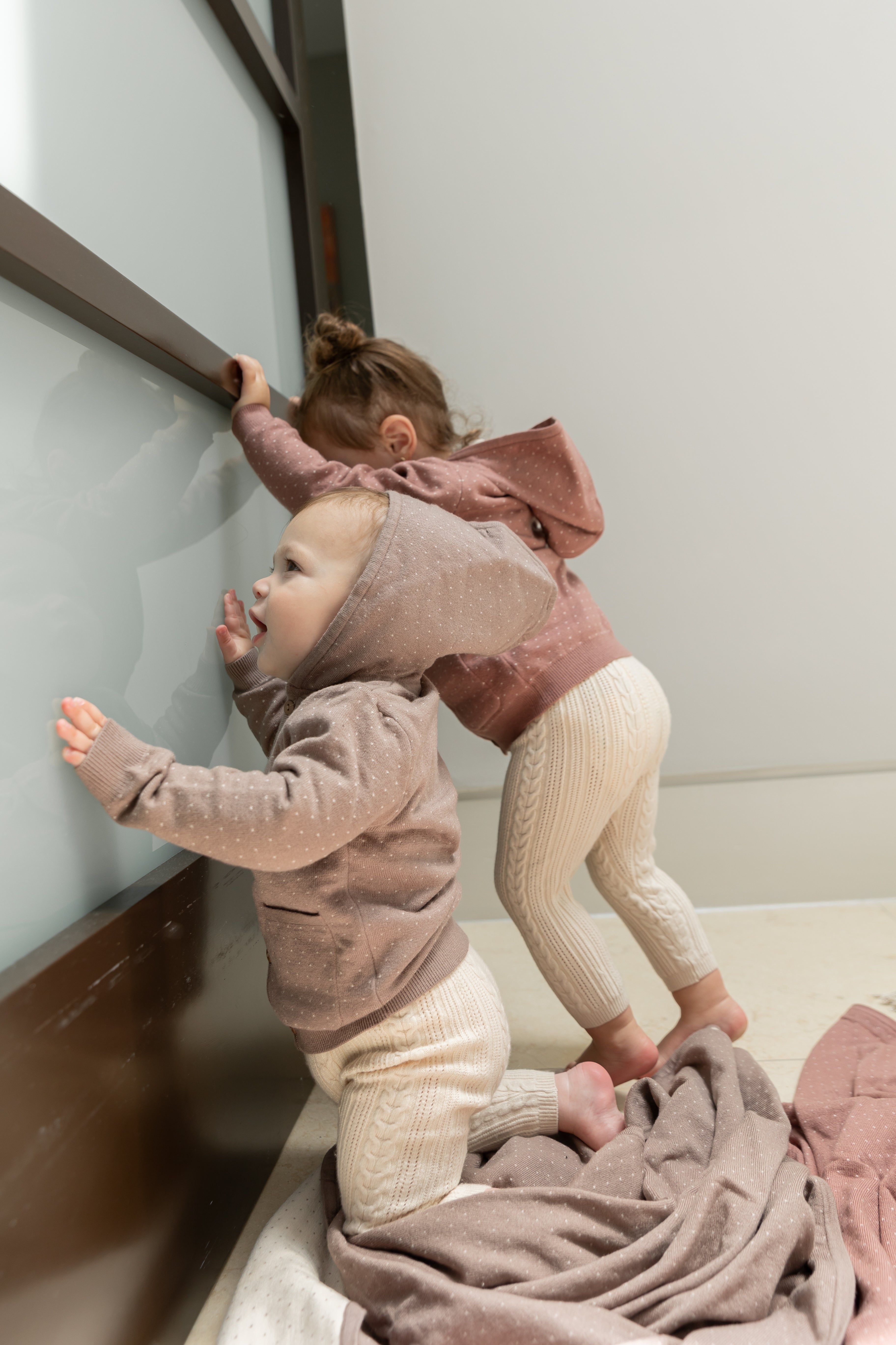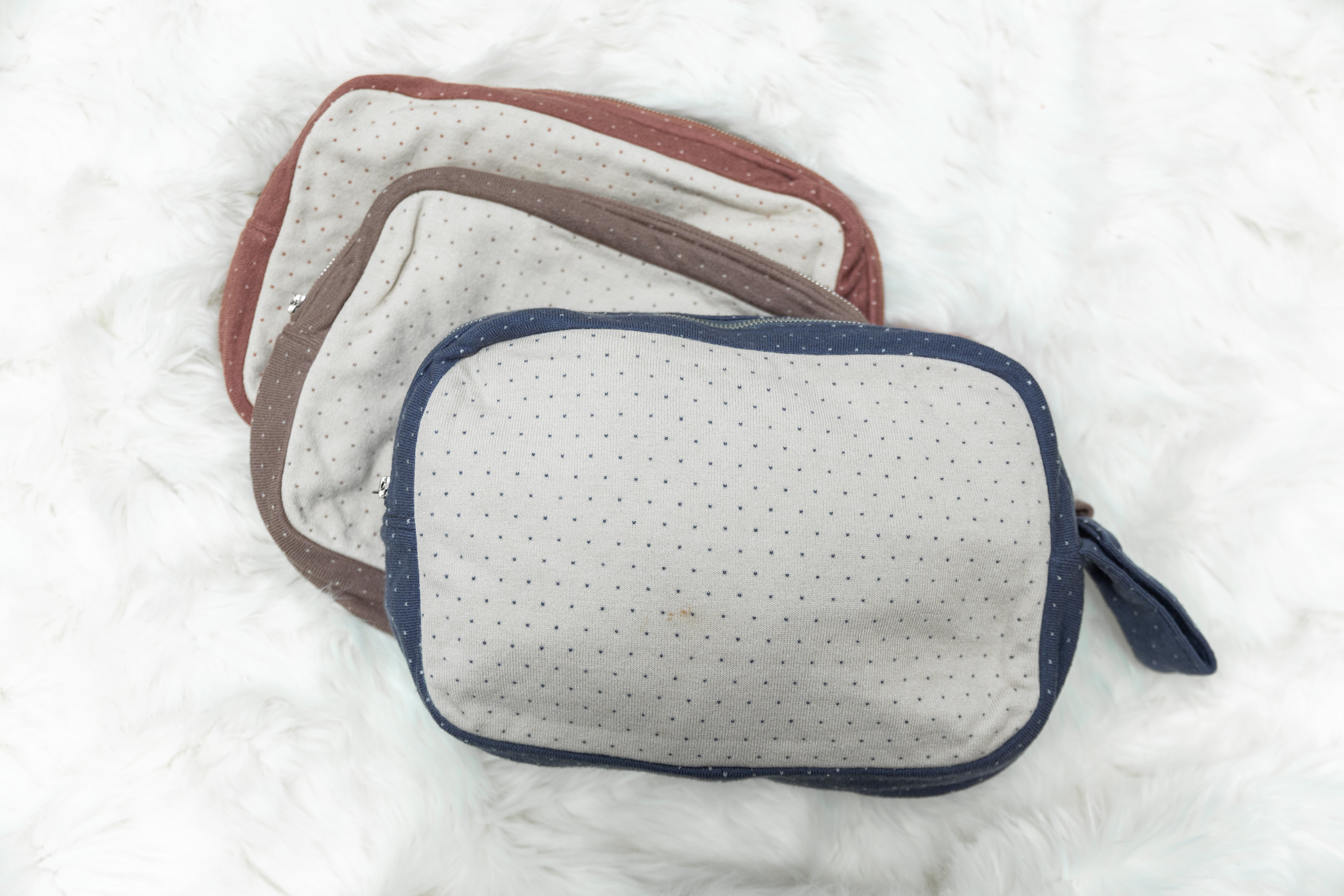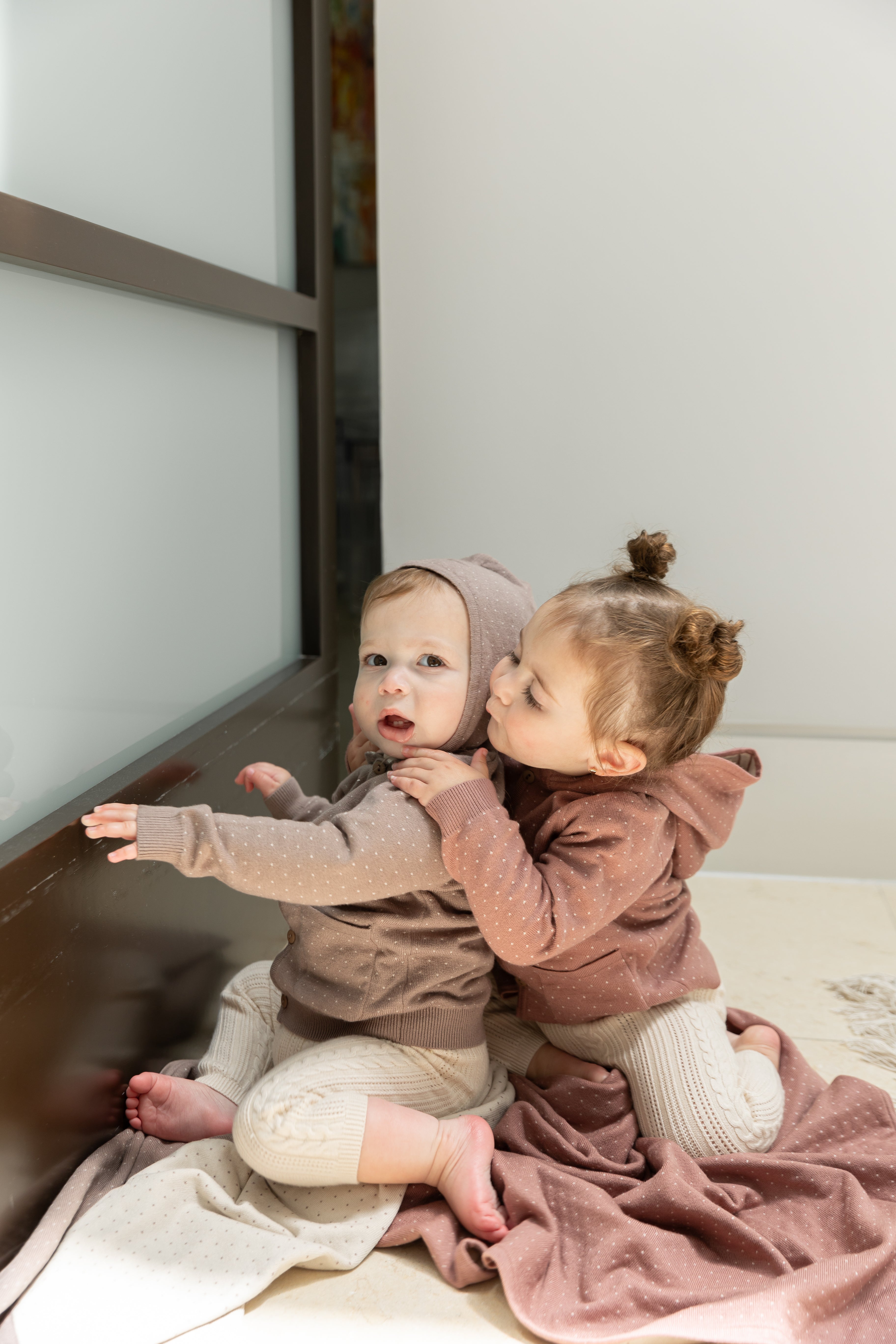 Baby boys and baby girls knitted blanket in matching pouch with dotted all over print and zipper on pouch opening. ֲ