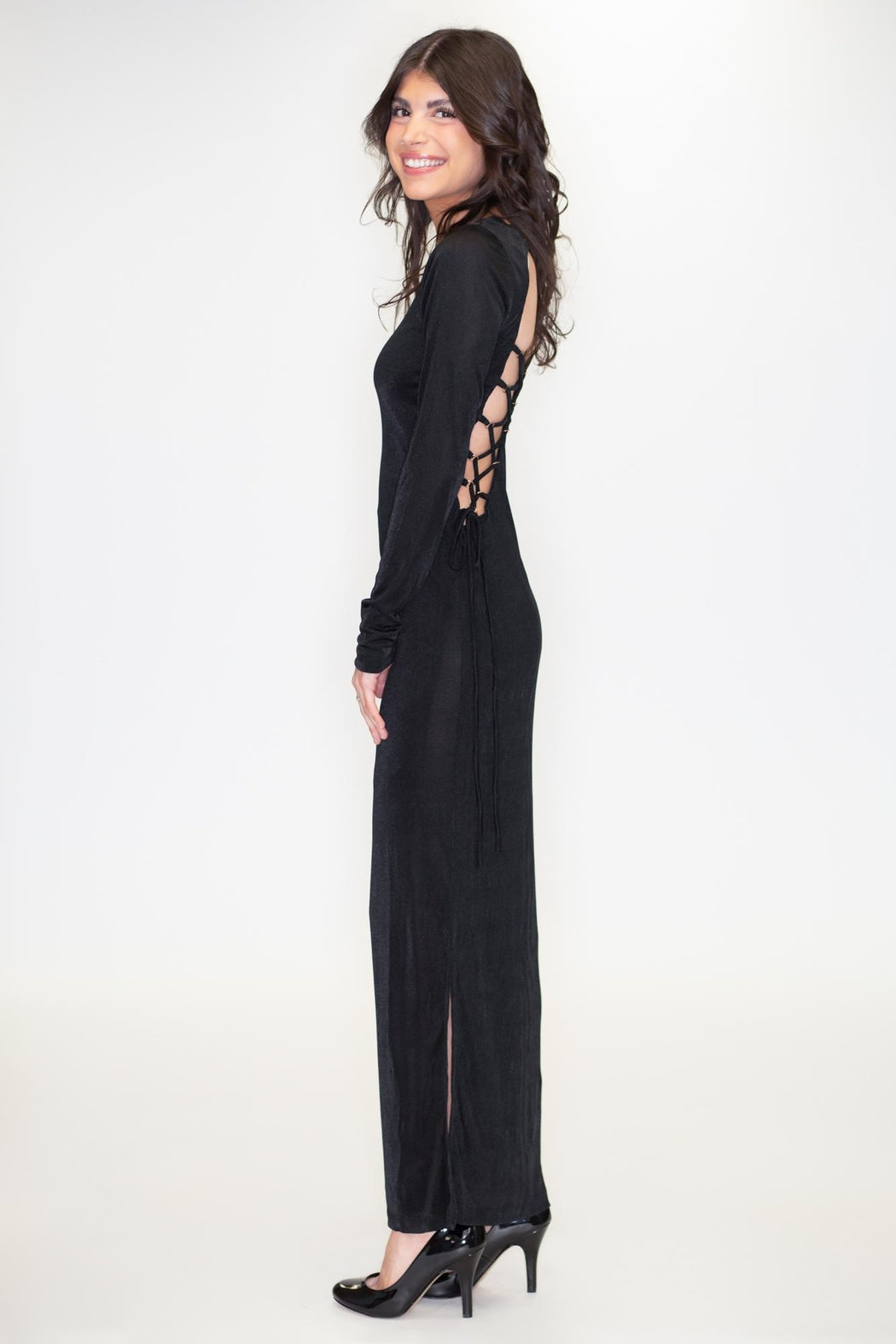 This captivating dress presents a round neckline with button closure, long fitted sleeves and a figure-flattering silhouette that allows you to flaunt your curves. A back cutout with asymmetrical lace-up detailing gives it an exquisite finish.