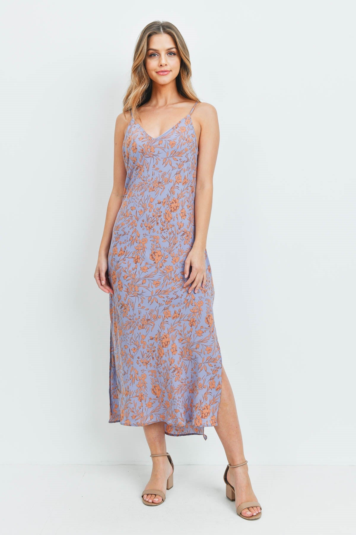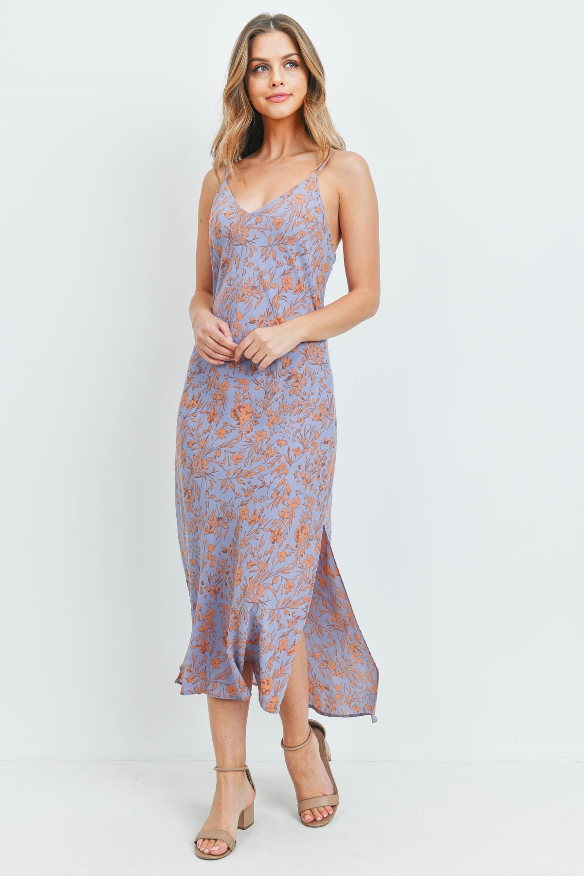 This beautiful dress is your must have outfit for your Summer semi-casual event! Whether you are going for vacation or for a picnic weekend, this dress will take you there! It features beautiful terracotta floral prints all over contrasting the lavender body color, both legs side slits, front V-neckline, adjustable spaghetti straps, a midi length, fit and relaxed bodice style, fully lined, material has some stretch. Wear it with a pair of wedges, flat sandals or even strappy high heels for a step up style. Model wears size Small L: 50" B: 32" W: 30"