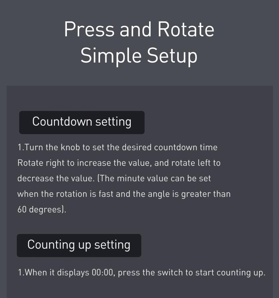 - EASY TO USE AND INTELLIGENT BATTERY SAVING- Twist One Button Operation Design, Great choice for seniors and kids.Metal knob and Black body,just twist the knob to set the time,press to start or stop. The digital light will be darken in 5 seconds and shutdown in another 5 seconds , which will last the battery life.