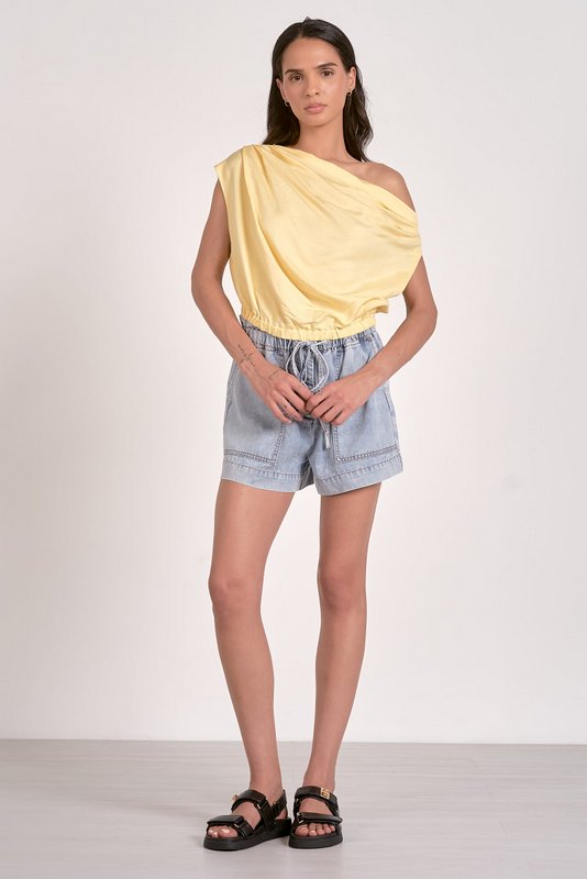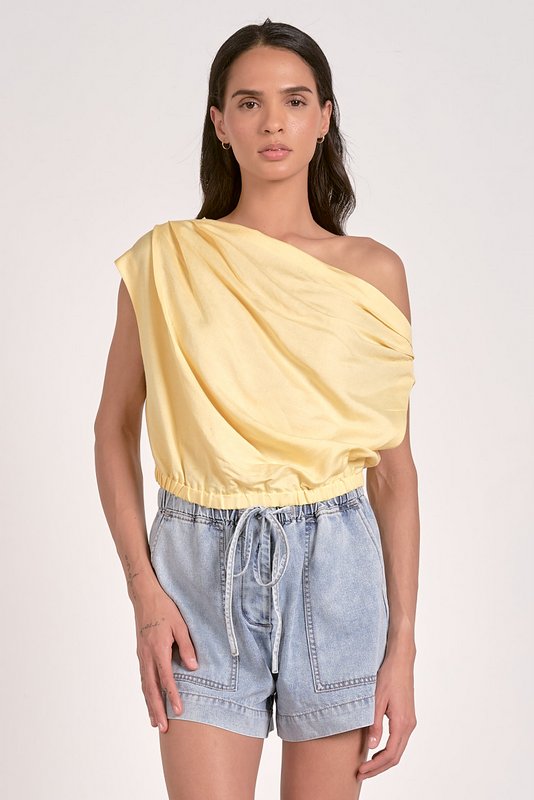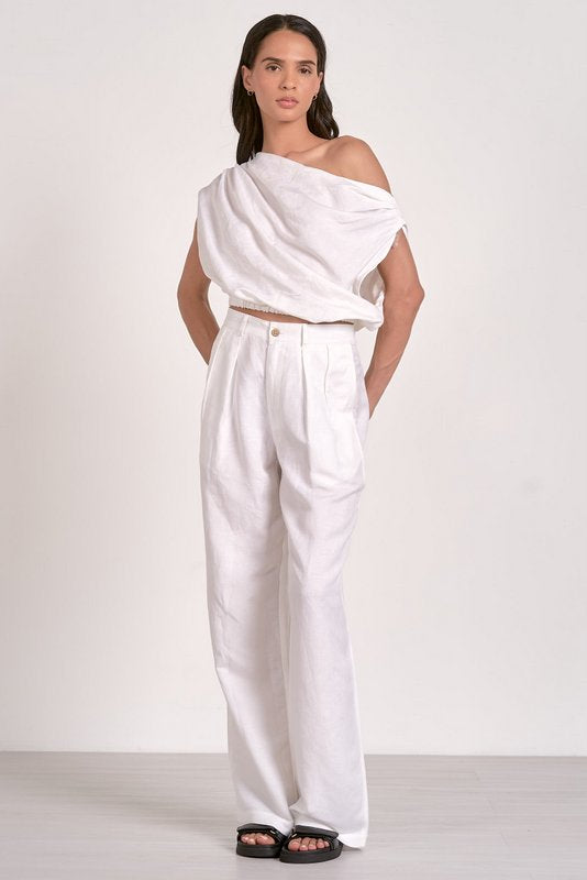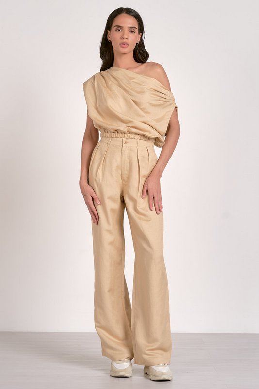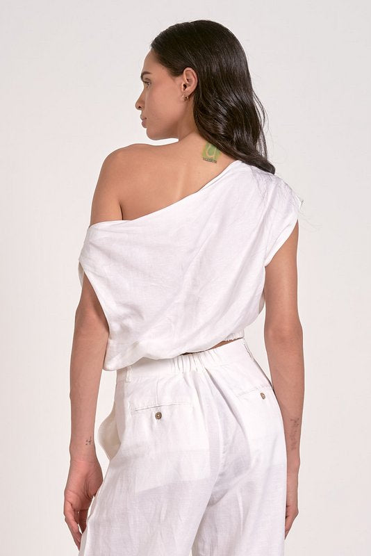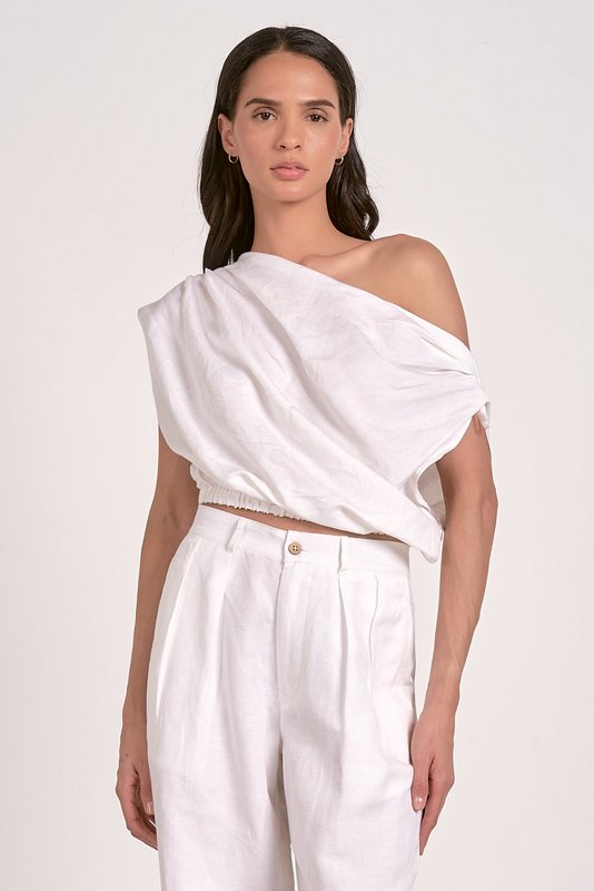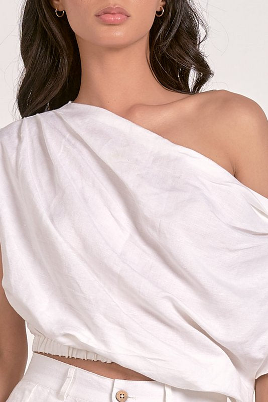 The Lianne One-Shoulder Top features elegant draping and a sleek asymmetrical one shoulder design. Crafted from a cotton-linen blend, it offers a lightweight feel with a soft, natural finish. Perfect for nights out—pair it with our Loren Pants for a stunning, elevated look