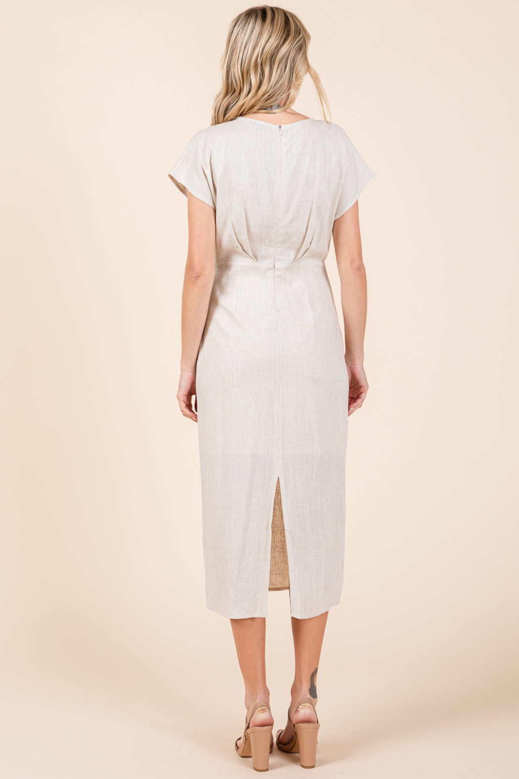 Linen V Neck Wrap Ruched Sheath Midi Dress