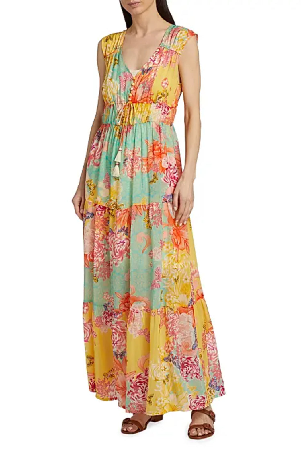 This Maje maxi dress from Johnny Was features a vibrant floral print, V-neck, and tiered design.