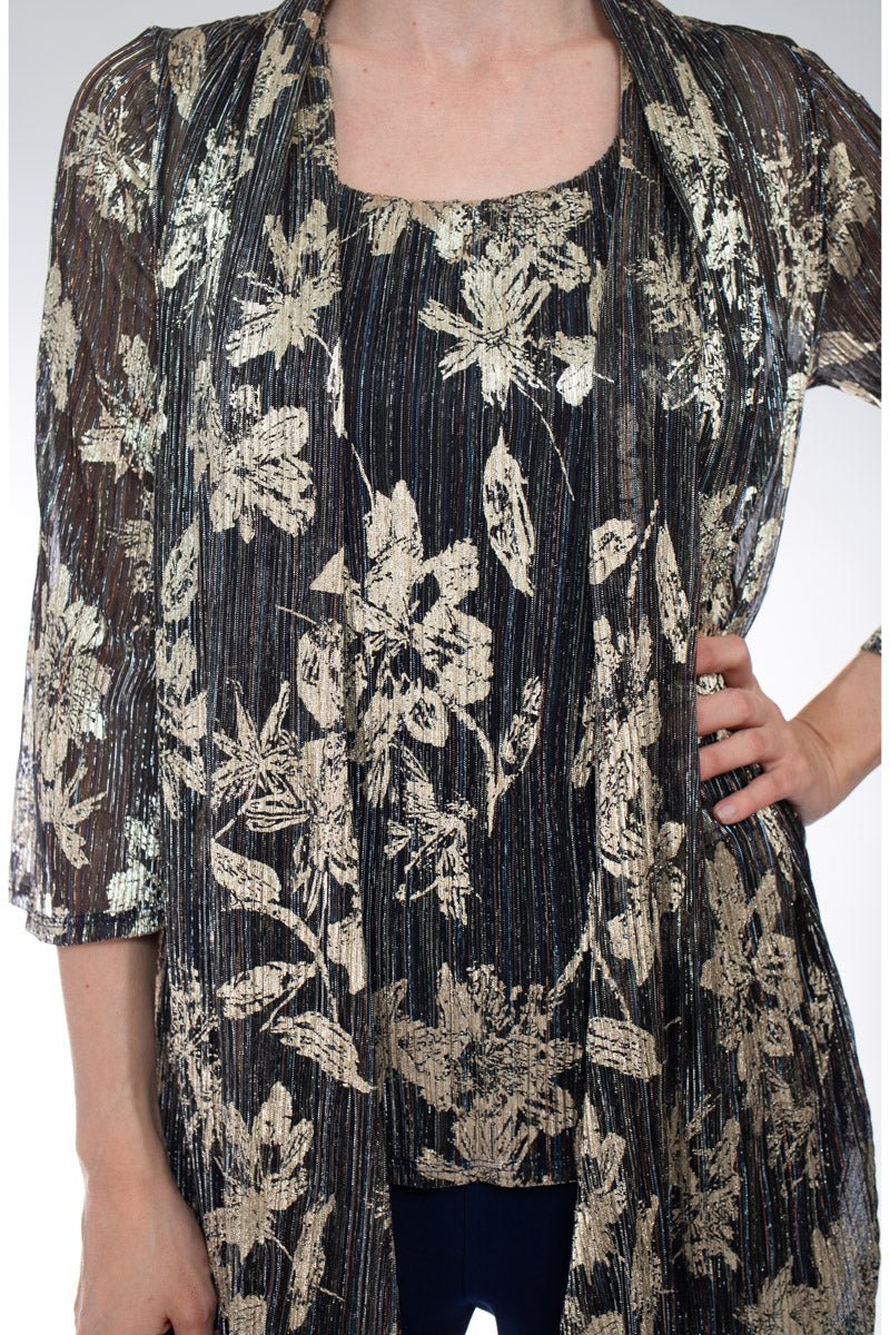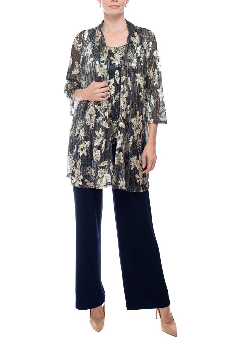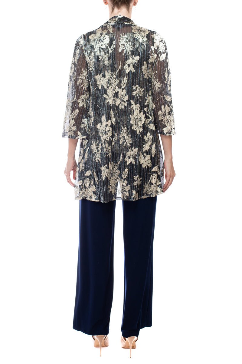 Glamorize for your special event with the Marina jumpsuit and jacket set. The sleeveless bodice is crafted from a metallic knit fabric with a scoop neckline, keyhole back, and solid matte jersey. The matching open front jacket completes the look, making this a sophisticated ensemble fit for a formal event or guest of wedding. The perfect look for the mother of the bride or groom.