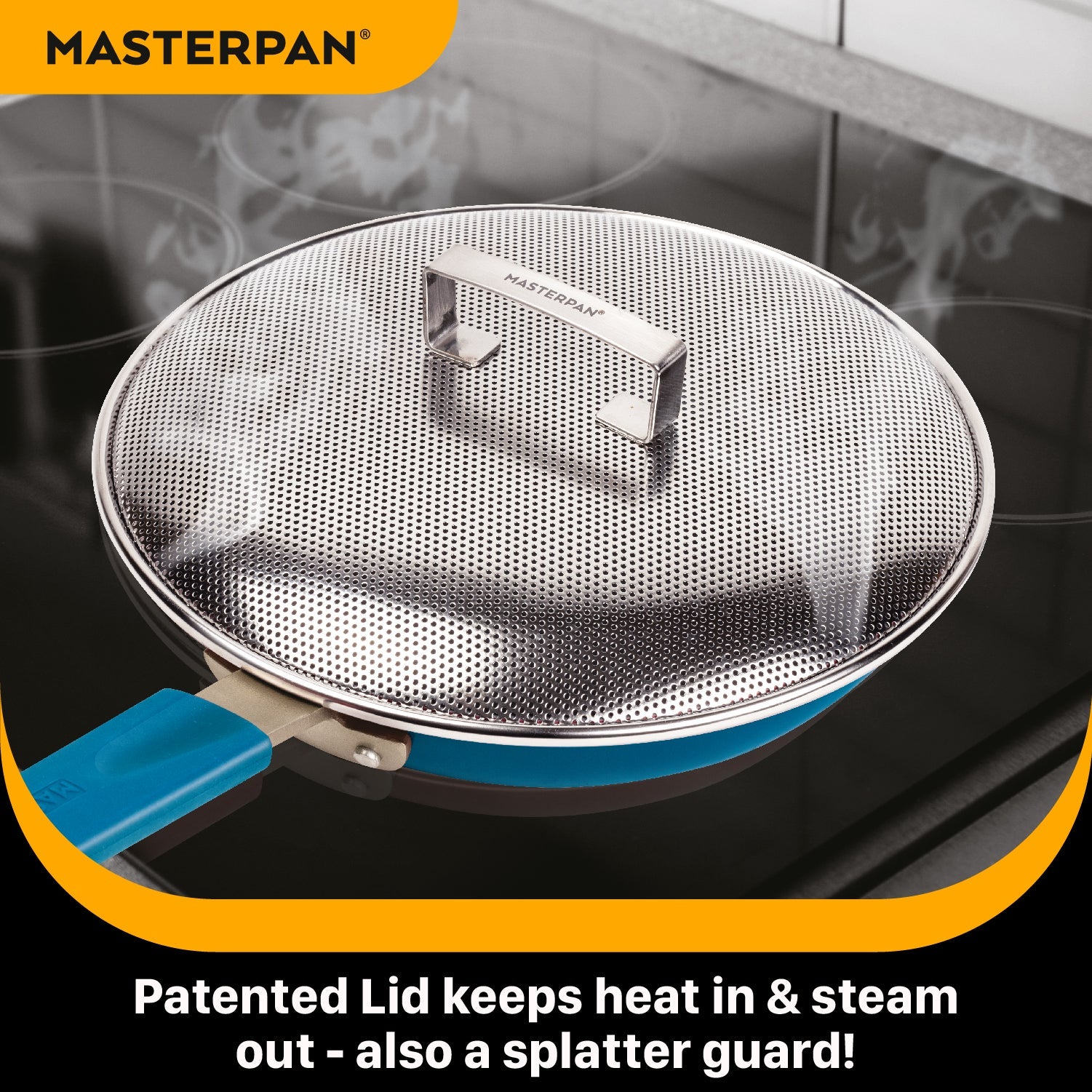 Introducing the unique MASTERPAN 9.5” (24CM) Stovetop Oven Fry Pan & Skillet. The only pan that has the features of an oven but can be used on a stovetop. Instead of waiting to heat up your oven and then baking your food for lengthy periods of time, use our stovetop oven fry pan to cook frozen foods and other foods you would put in the oven. The lid is made from stainless steel for longer lasting use and has over 5000 laser etched holes that act as a splatter guard preventing hot oil splashing out, retain heat on the inside but releasing steam at the same time to avoid condensation on the inside. Creates a close to perfect oven-like temperature on the inside reheating fried food and pizzas to its original hot and crispy state. Lid can be used as a splatter guard for any other pot or pan between 8-9.5” as well. Works great for frozen foods without having to heat up a big oven just for frozen fish fingers or burgers. Ideal in re-creating an oven environment on camping trips and smaller homes with no ovens. 4 colors to choose from.