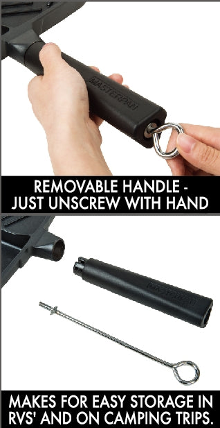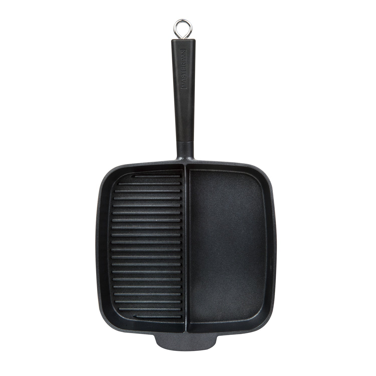 The MASTERPAN 11”x11” 2-Section Non-Stick Cast Aluminum Grill & Griddle is an easy-to-clean skillet providing a superior Xylan Plus double layer non-stick coating by Whitford—safe and durable for daily use. The skillet can be safely used on any heat source, including induction.  With a ribbed grill and a flat skillet side by side,  you can grill meats or fish on one side while frying eggs, vegetables, or pancakes on the other - calling all superstar chef multi-taskers! The cast aluminum 2-section skillet has a thick base ideally designed to balance heat flow evenly, and features a removable ergonomic bakelite handle for safe maneuvering. This skillet is dishwasher safe, as well as PFOA, lead, cadmium, and heavy metal free.