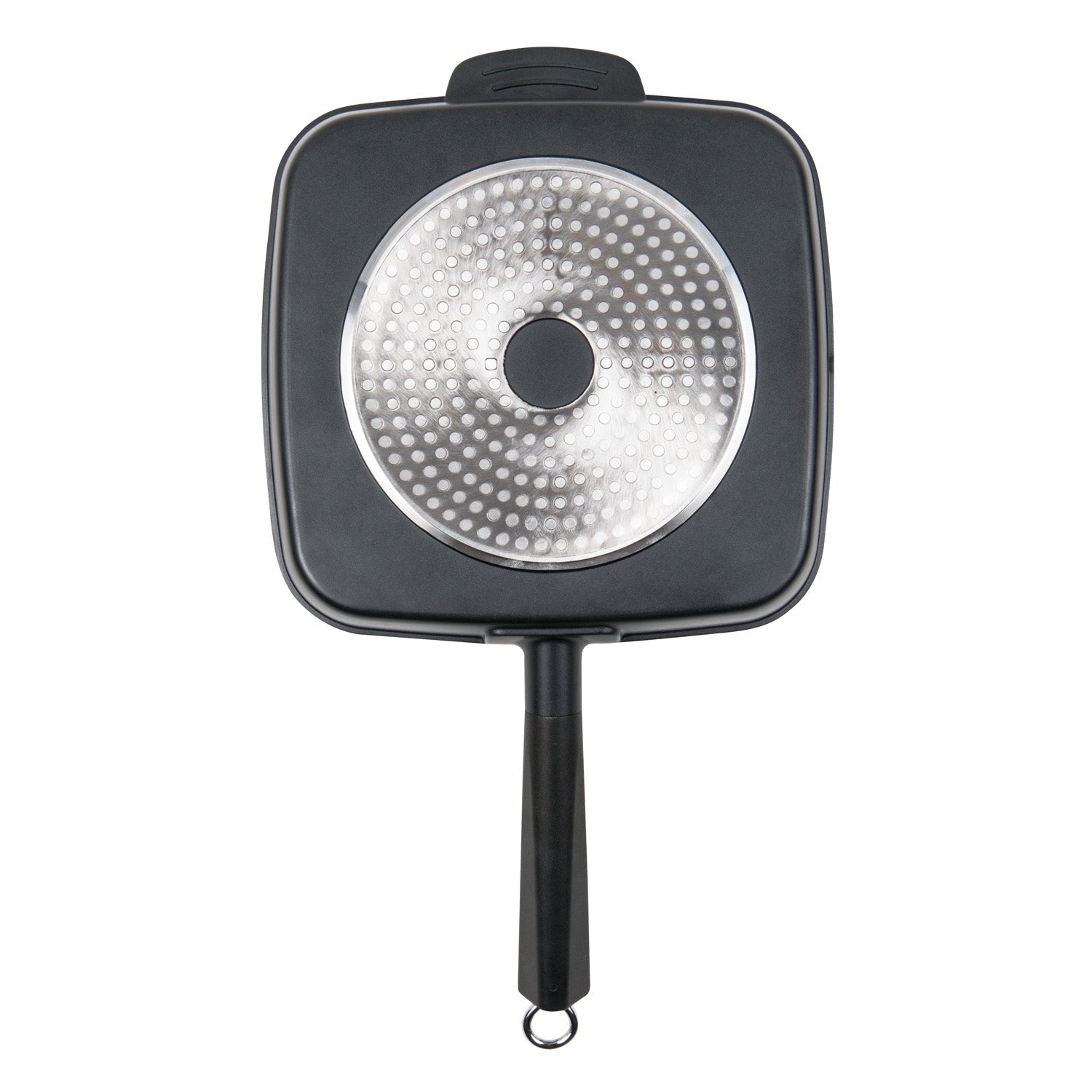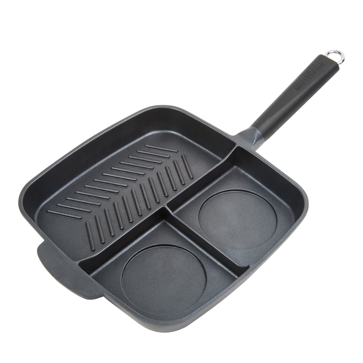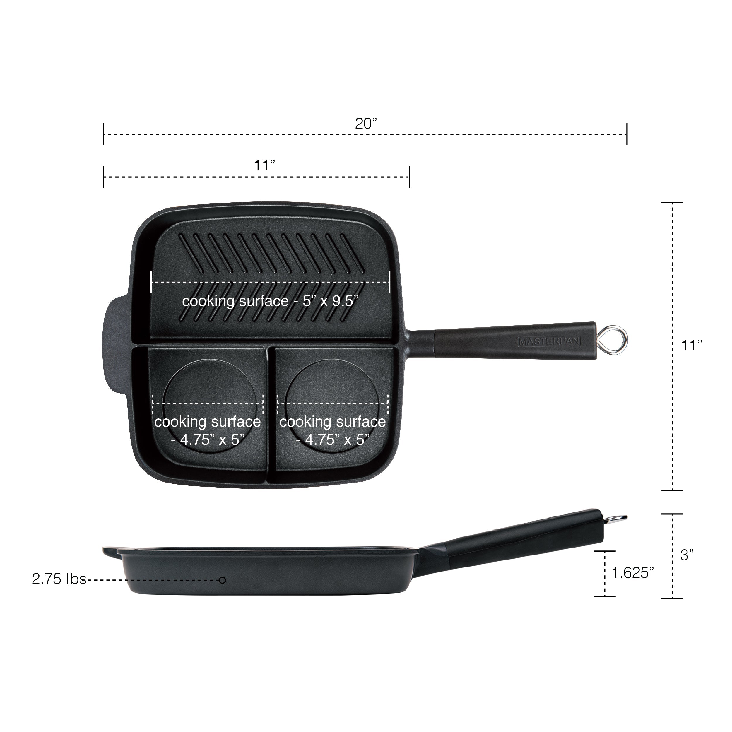 The MASTERPAN 11”x11” 3-Section Non-Stick Cast Aluminum multi-section skillet is an easy-to-clean skillet providing a superior XYLAN PLUS double layer non-stick coating by Whitford, safe and durable for daily use. Cook up to 3 different foods all at once on one burner. Prepare a complete breakfast, big burger meal, full fajitas, or a healthy salmon dinner with veggies. The possible food combinations are endless. Plus, when youre finished you'll have just one pan to clean. Why use multiples pans to make a great meal when you only need one? Cook faster, clean less, and still enjoy great meals! - Multi-sectional design - cook 3 foods at once! The skillet can be safely used on any heat source, including induction. The cast aluminum 3-section skillet has a thick base ideally designed to balance heat flow evenly, and features a removable ergonomic bakelite handle for safe maneuvering. This skillet is dishwasher safe, as well as PFOA, lead, cadmium, and heavy metal free.