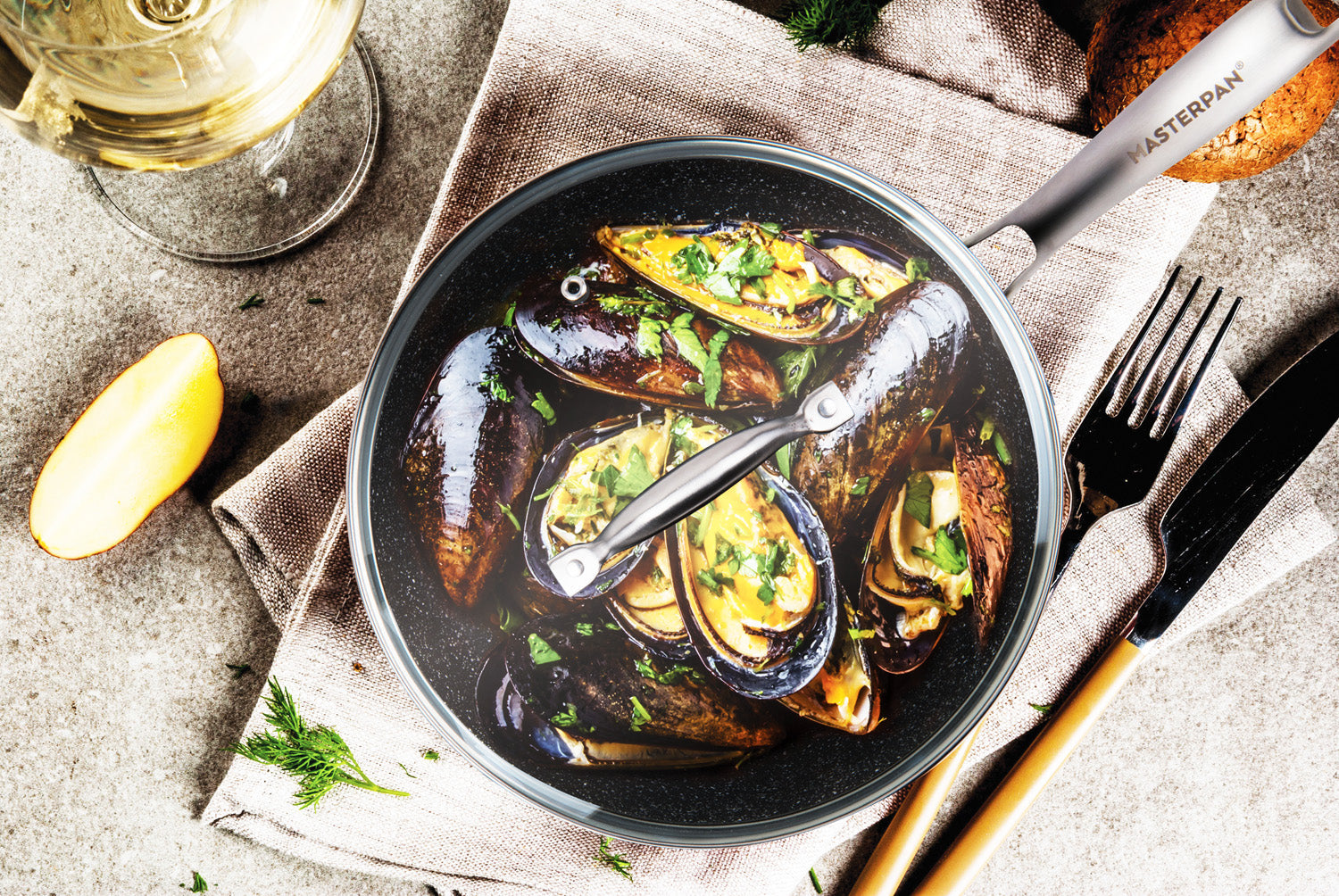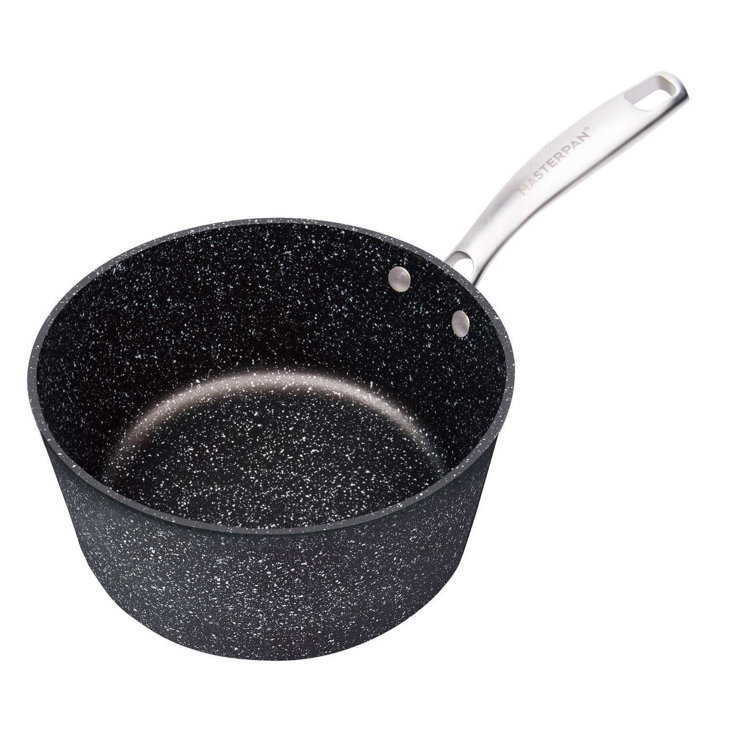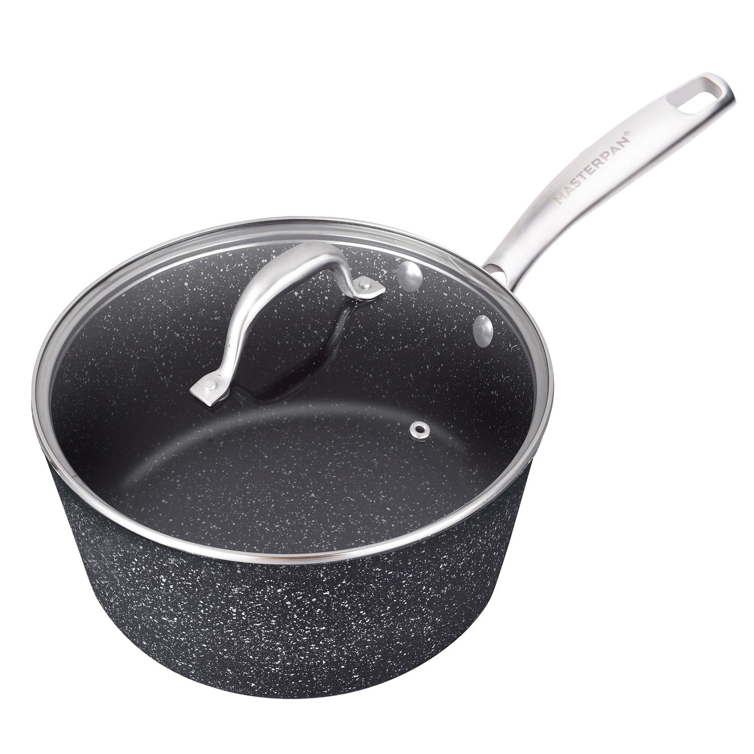 The MASTERPAN 2 QT. (7”) Non-Stick cast aluminum Sauce Pan comes with a glass lid, stainless steel handles, and a top quality 2-layer sand blasted premium non-stick coating that is PFOA, lead, cadmium, and heavy metal free, which will last far longer than your conventional non-stick cookware, and can be used on any heat source including induction stove tops. As part of our Granite Series, the pan boasts a streamlined black-grey granite stone look inside and out. This non-stick sauce pan is ideal for stirring up a batch of grandma’s famously delicious homemade pasta sauce, and the best part is, the clean-up will be painless. The heavy gauge base is designed to distribute heat evenly throughout the pan for amazing results even when searing foods. The sturdy and ergonomic stainless steel handles allows this pan to be dishwasher safe. Cookware that is guaranteed to perform as amazing as it looks!