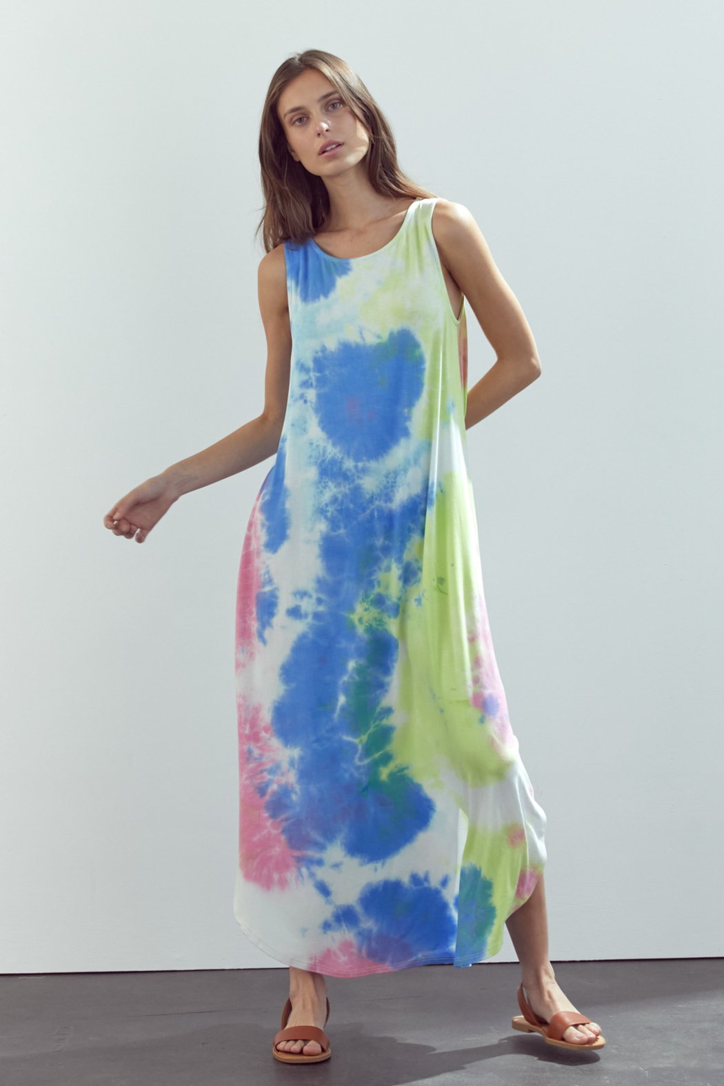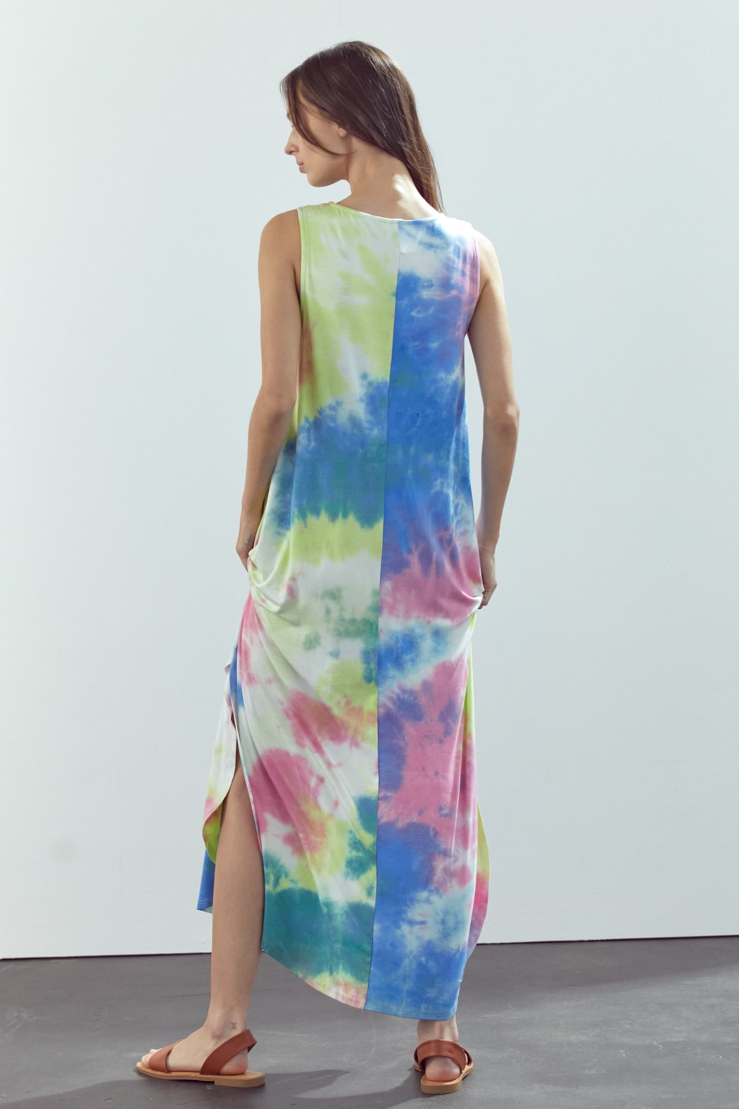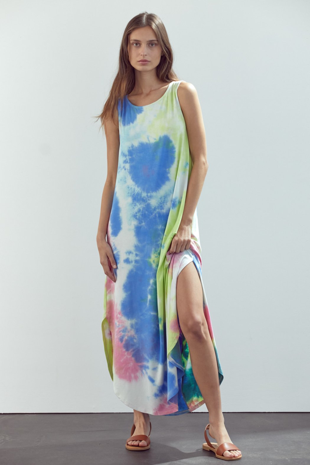 Sleeveless Crew Neck Maxi Dress In Tie Dye Rayon Spandex Jersey