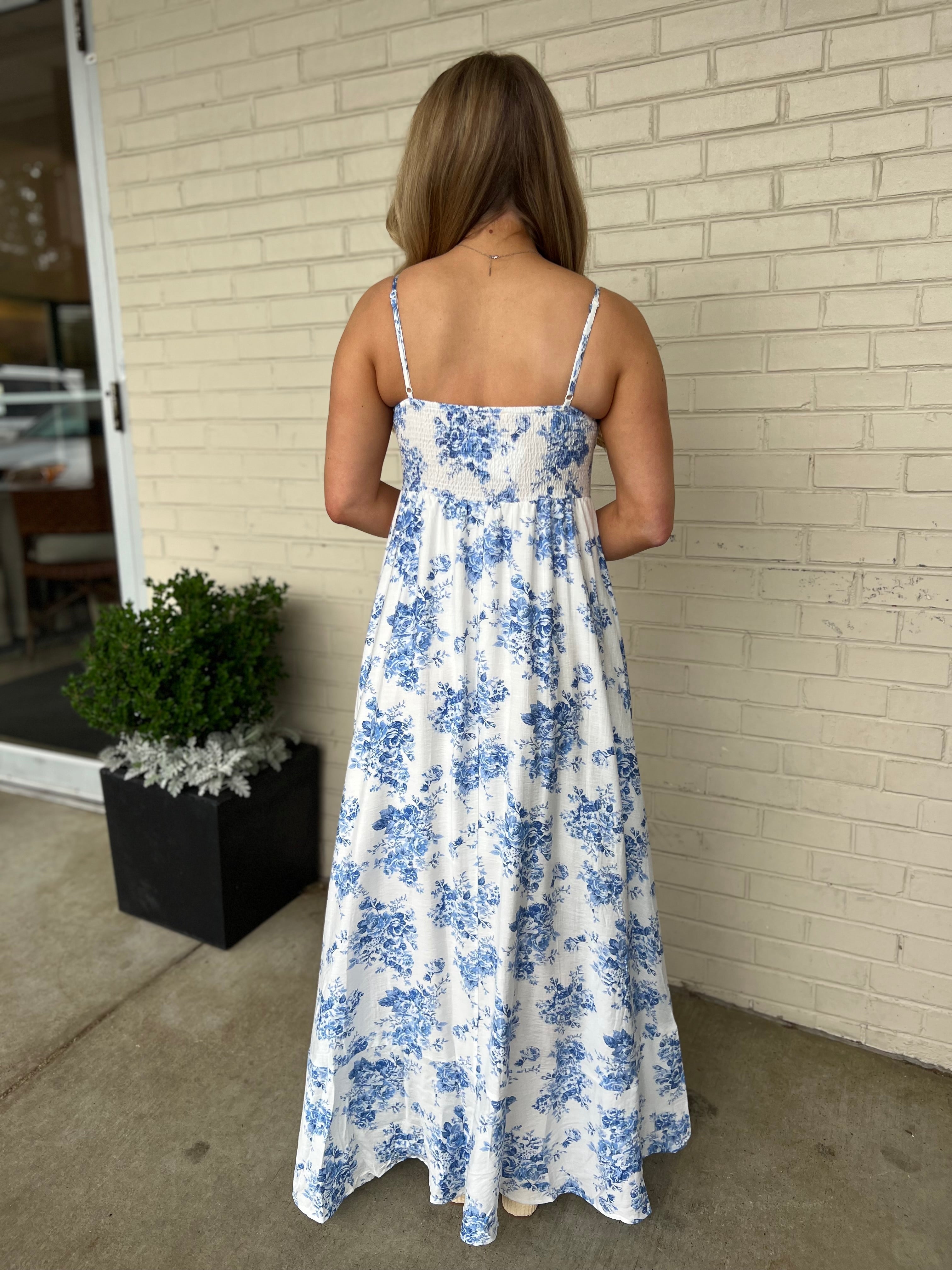 Twirl through summer days in the Melanie Maxi Dress! This playful sleeveless beauty features a flattering square neckline and dreamy off-white fabric adorned with blue floral prints. Perfect for brunches, beach walks, or dancing under the stars – just add sandals and your favorite sun hat for an effortlessly chic look!