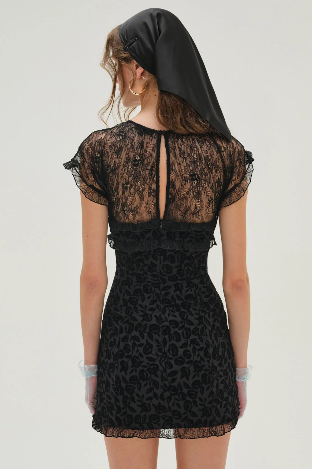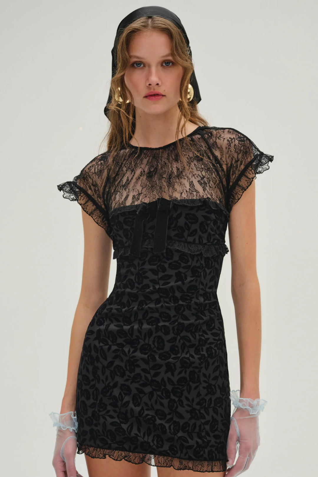 Elegant and dramatic, this Midnight Velvet Mini Dress is a show-stopper. Crafted in a burnout velvet with a contrast lace shirred neckline and sleeve panel, cut to an empire waist and features a ruffled trim and a velvet black bow. Perfect for cocktail events or winter parties.