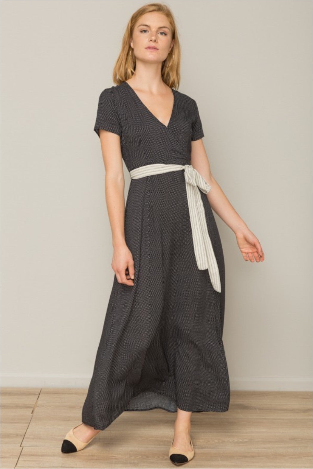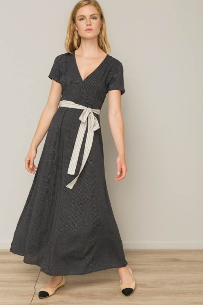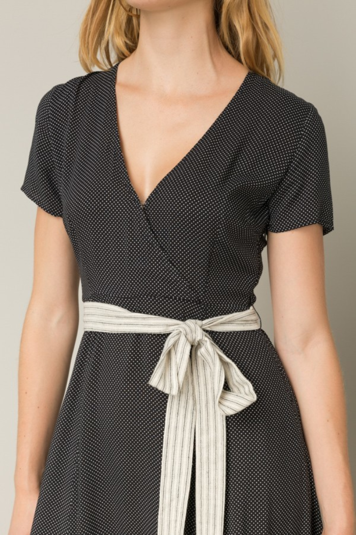 Classy, adorable and super cozy is what this dress is all about! Our maxi dress features mini ivory polka dot prints all over, a contrasting stripes fabric self tie band belt around waist, a front surplice V-neckline, short sleeves, hidden side zipper closure, material has little stretch, partially lined. Wear it under a long knit cardigan during the cooler nights for the transitional season! Model height is 5’9 and wears size Small.