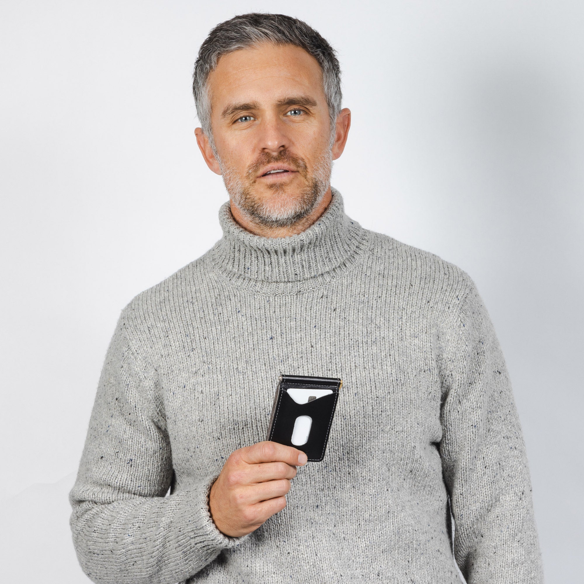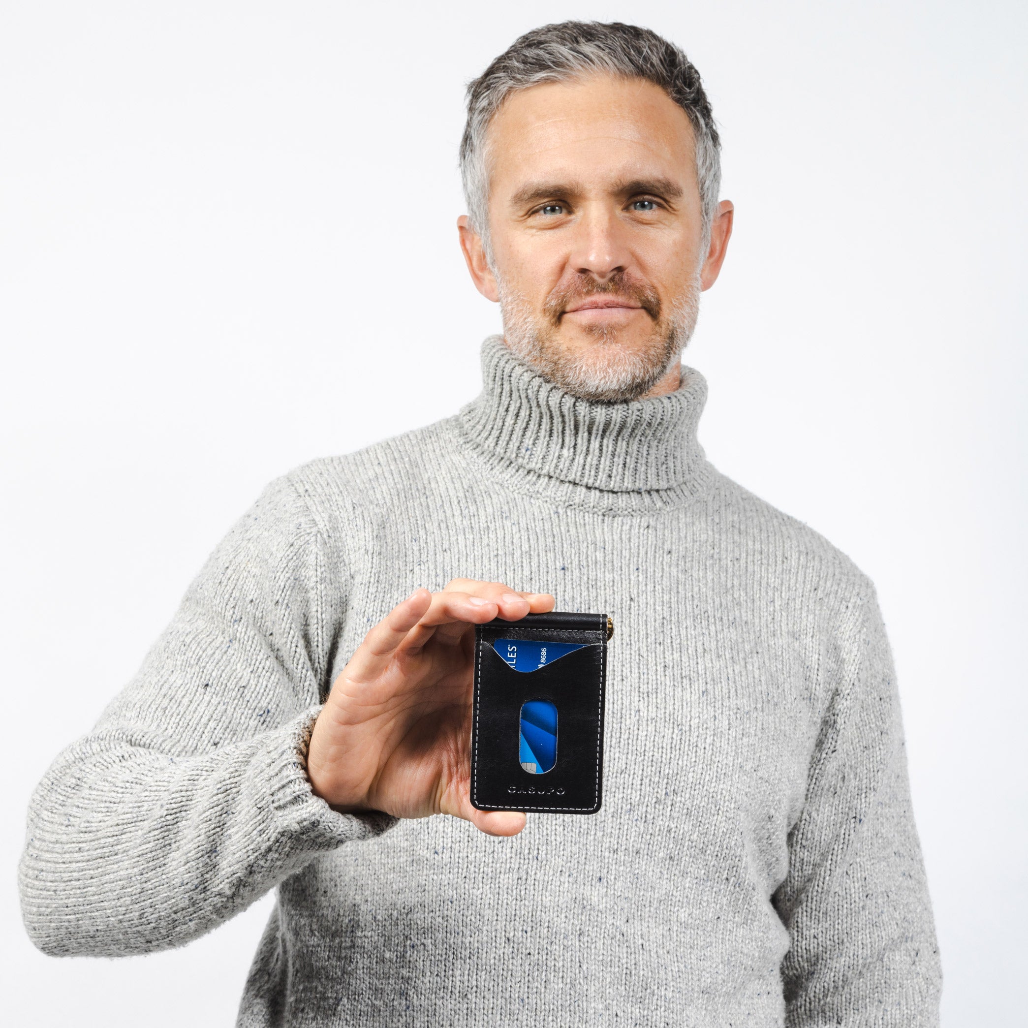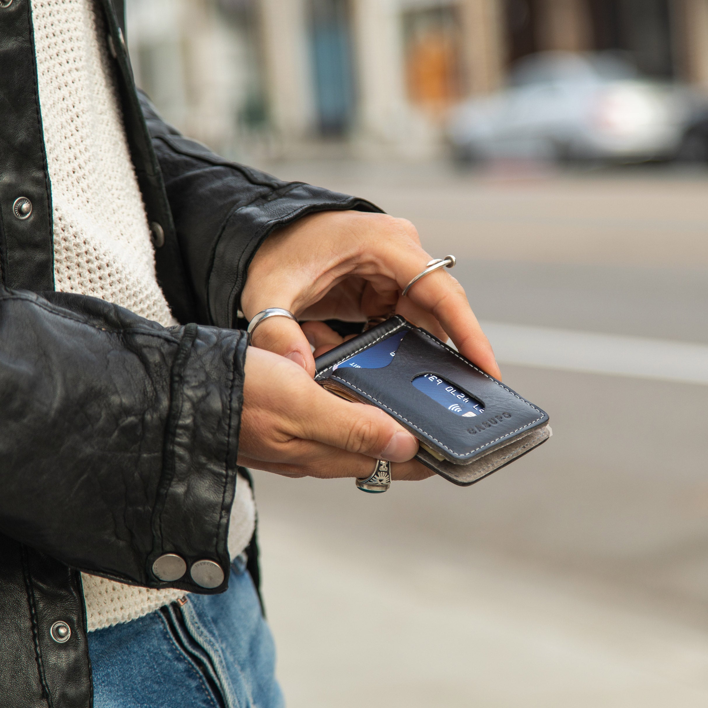 It comes equipped with two external pockets and a money clip for cash in the middle. It is simple, practical and stylish. It is handmade in Los Angeles with naturally dyed leather so it is non toxic and biodegradable.