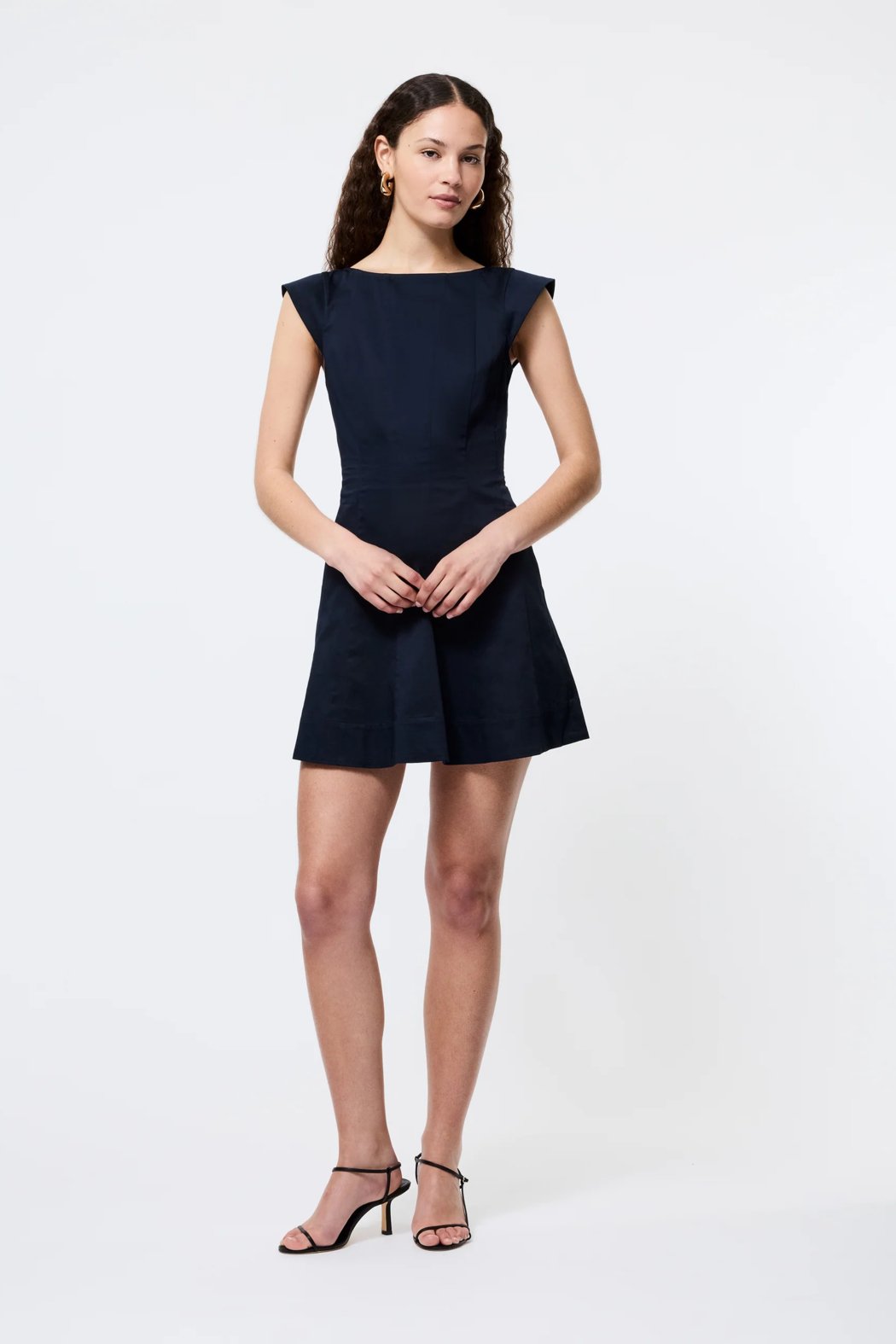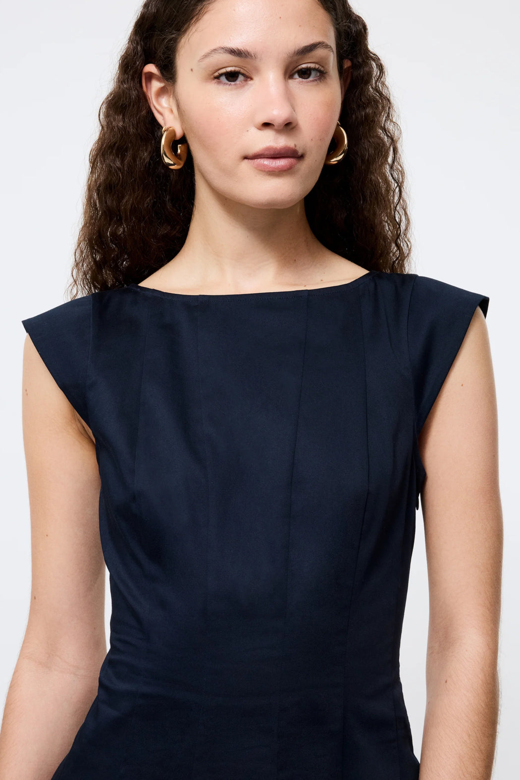 Cocktails, anyone? The Multi Seam Sateen Dress is made from suiting-weight cotton sateen with just enough stretch to keep things comfortable. It features a boat neckline, a low back, and multi-seam details that hug your curves before flaring into a flirty skirt. This dress will take you from brunch to dinner, effortlessly. Mini dress Fabric: cotton sateen, suiting, stretchy, navy Boat neckline Low back Cap sleeves Fit & flare silhouette Size S measures 32" to hem