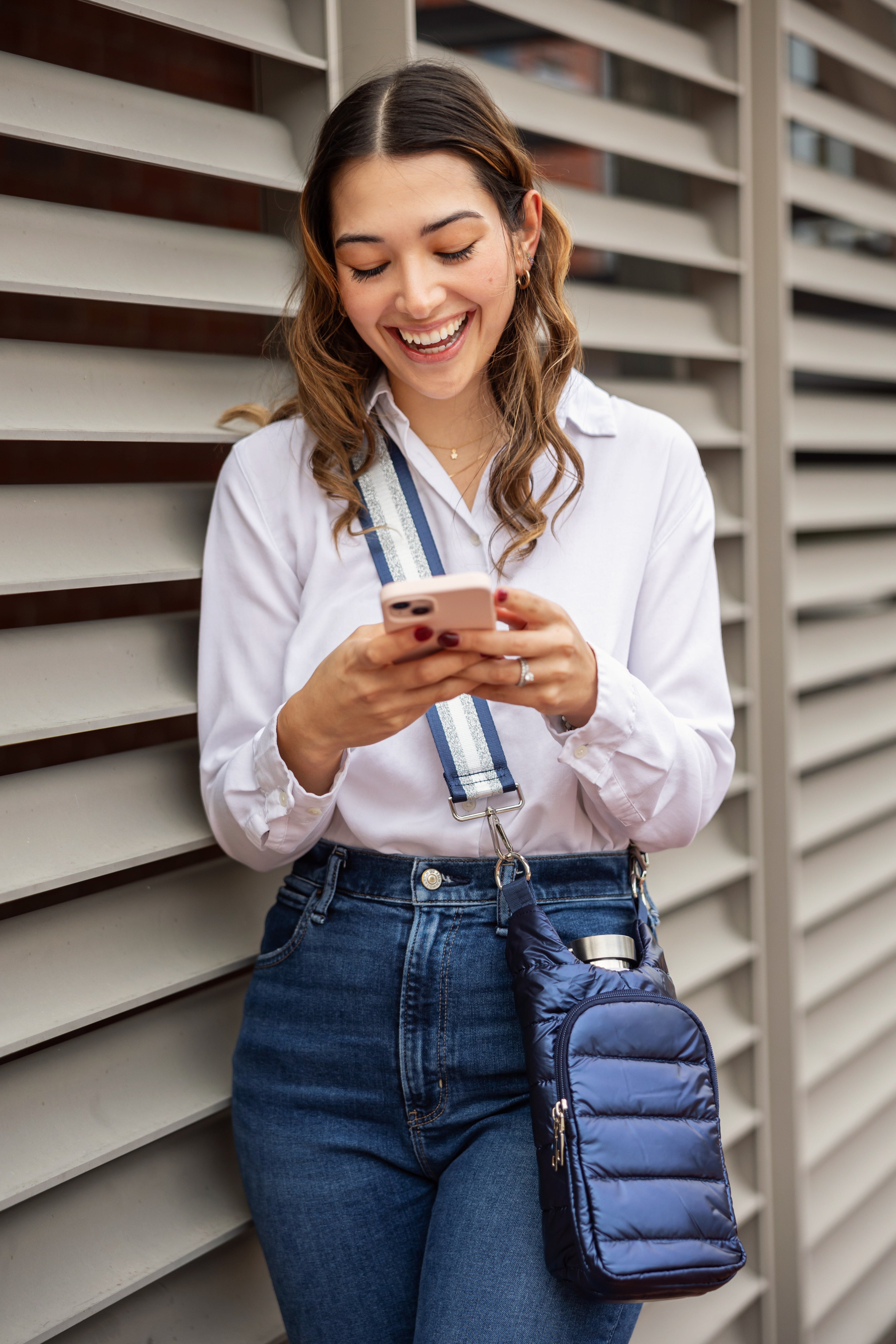 • Puffer Coat fabric: Navy shiny w/ adjustable and interchangeable Striped glitter strap