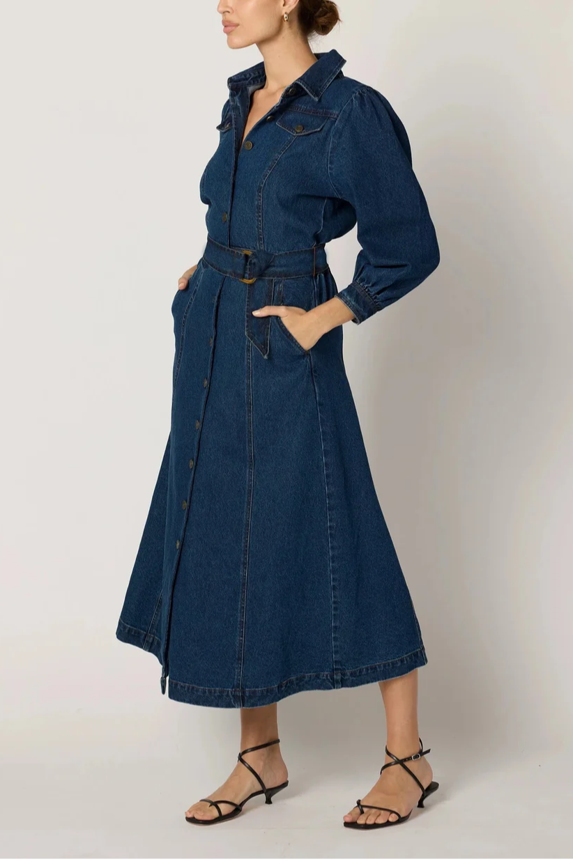 Ethically handmade in India from 100% organic cotton denim, the Naya Midi Dress features a collared button down design and adjustable belt at the waist. Elegant and chic, this dress is perfect for any occasion. Dress up with a pair of strappy heels or dress down with a pair of boots. Ethically handmade in India Bra friendly Collared button down dress adjustable belt Buttoned cuff with placket slit at back hem Hand wash cold, lay flat to dry, or dry clean Ana is 5'9.5" and is wearing a size S Nancy is 5'10" and is wearing a size S This item runs small, size up if in between sizes