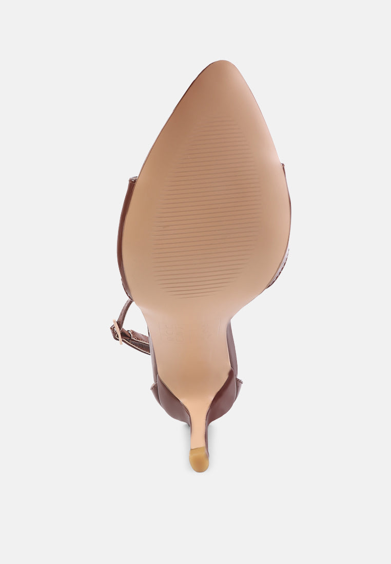 These delicate and subtle sandals come with an ankle strap and an open pointed toe. The stiletto heels add a sexy demeanor, while the soft innersole helps reduce stress on your feet. Looking for the perfect pair of comfortable heels for a cocktail party? These are your best bet.