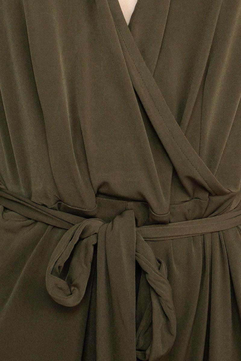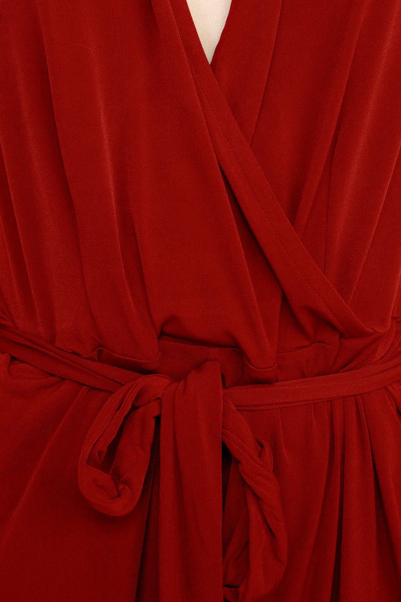Crafted from soft, stretch-infused jersey (95% Polyester, 5% Spandex), this machine-washable jumpsuit drapes beautifully without clinging. The V-neckline elongates the neck, while the sleeveless cut offers breathability and effortless layering options. A front tie cinches the waist to enhance your shape, adding a touch of structure and polish to the relaxed silhouette.