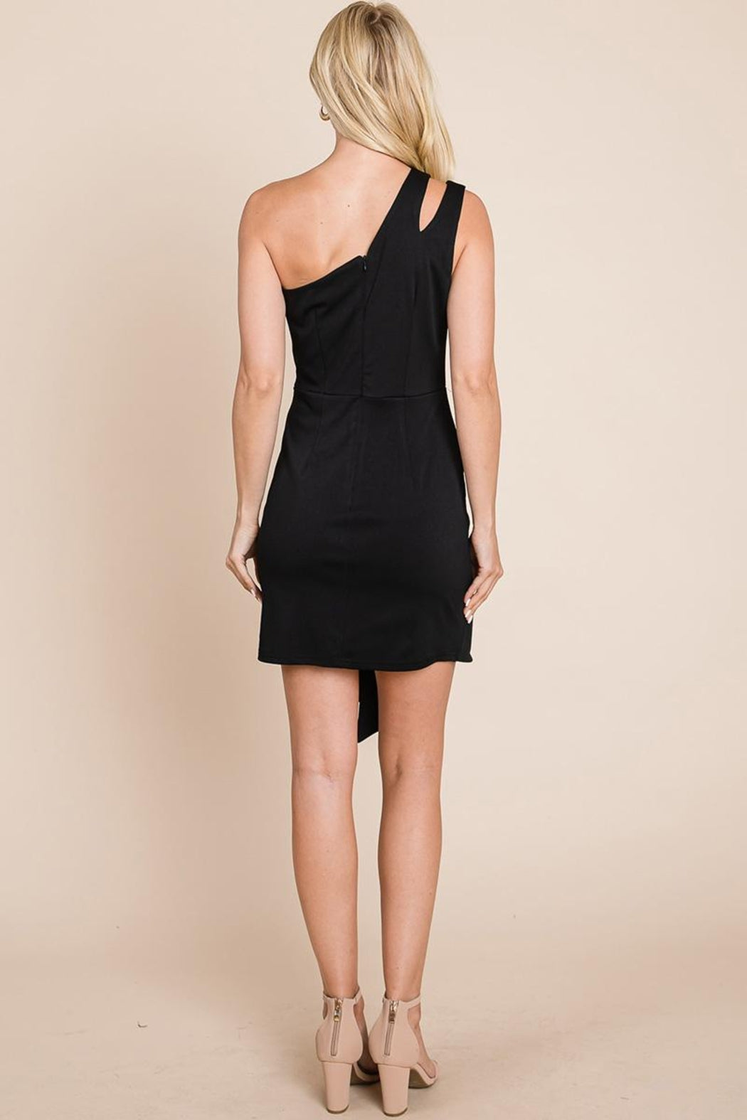 Features: One Shoulder, Cut Out, Pleated Front Twist Knot, Front Strap, Hidden Back Zipper Closure, Bust Dart, Fully Lined, Mini Length Made of Interlock Fabric(Good Stretchy) Model is 5'7"(32 23 34.5) wearing small- Front Length 34 Bust 34 S(4-6)/M(8-10)/L(12-14), True To Size