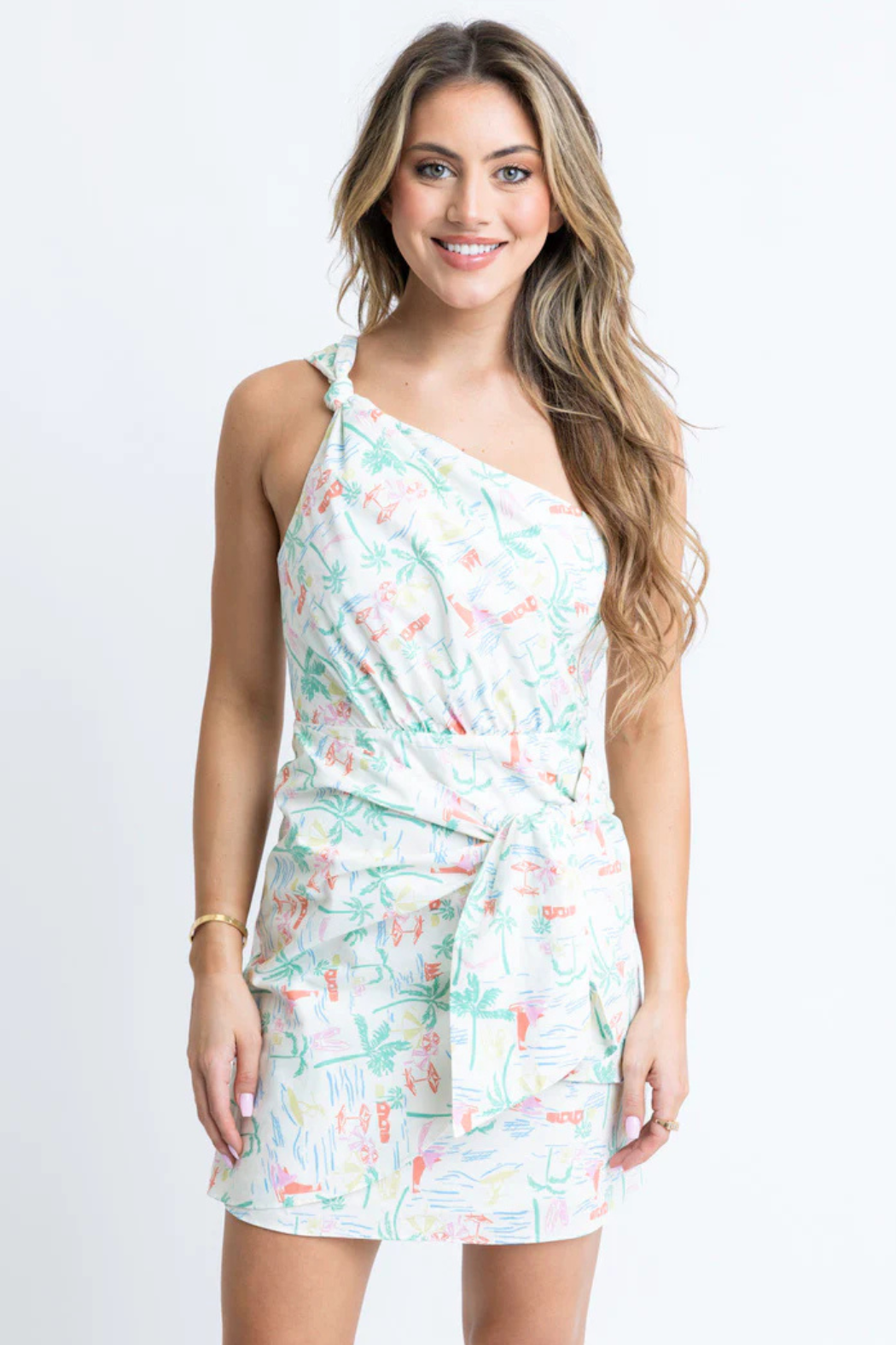Dress to impress with our Seashore One Shoulder Dress! Featuring a zip back, knot one shoulder, and tie waist, this dress will have you looking and feeling fabulous. The fun seashore print adds a playful touch, while the flattering fit will provide a boost of confidence.Model is 5'6", wearing a small.
