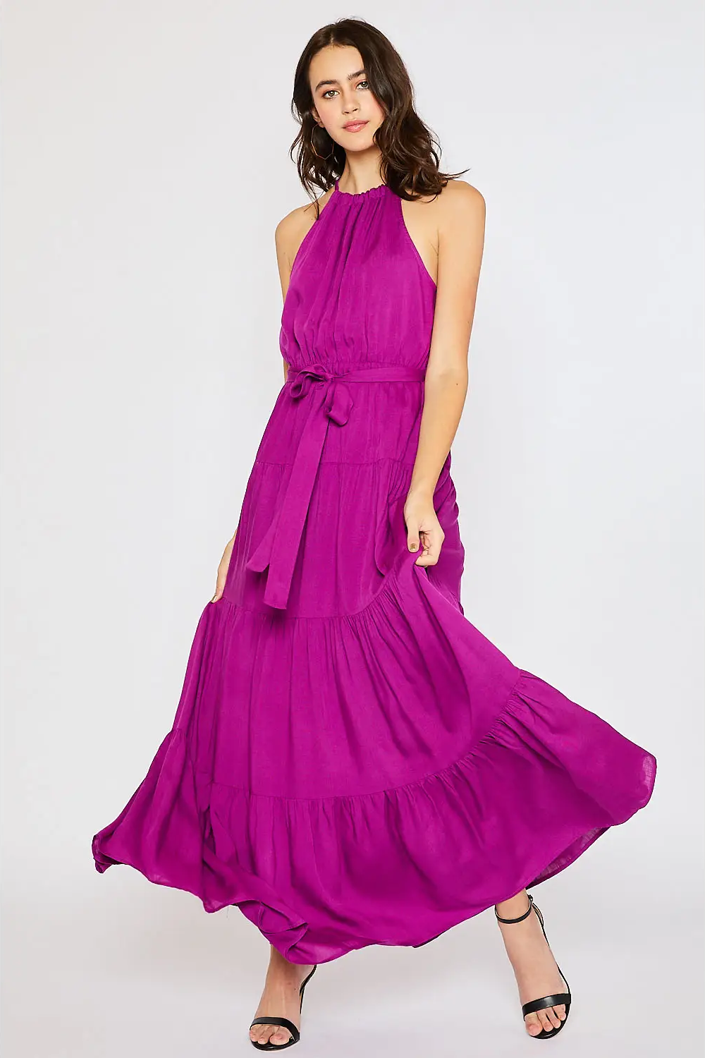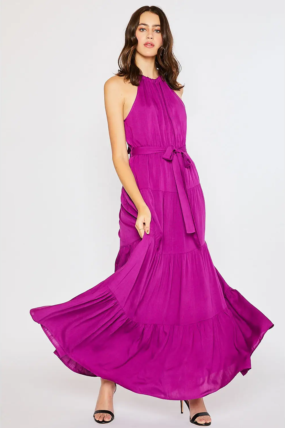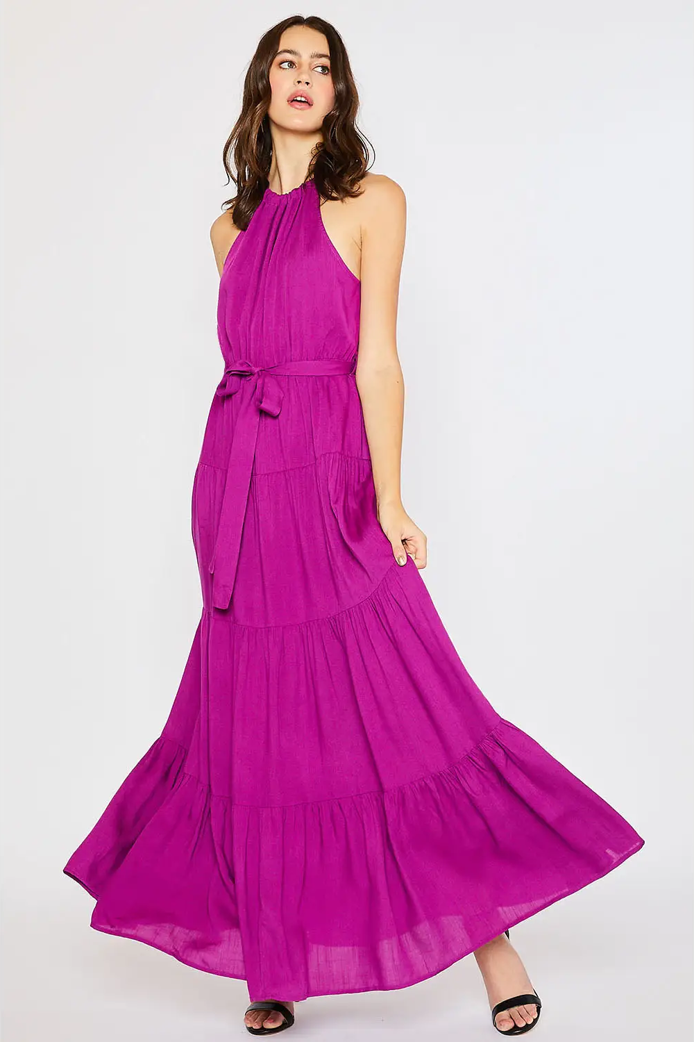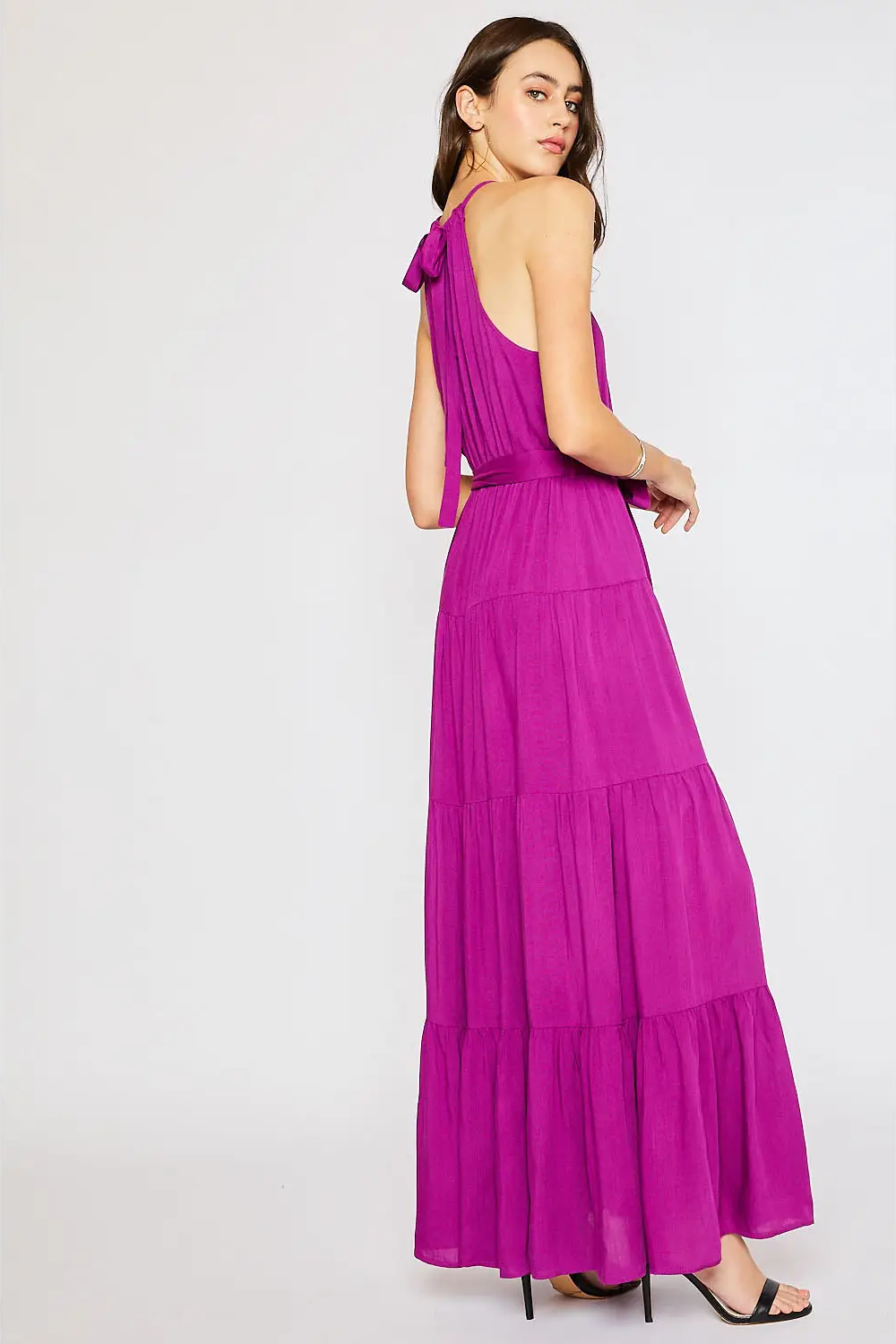 A staple piece in your wardrobe that is Simply gorgeous! This amazing dress features a beautiful rich purple color, a halter neckline with and adjustable self-tie on the back, bottom tiered hem in a flowy style, an extra matching waist self tie, lined, material has stretch. It can easily be dressed up with high heels for a classy and elegant look as a beach wedding guest outfit. Or just wear it with wedges, a hat and carry your summer basket for your next vacation destination. Model is 5’7” and wears size Small L:58"