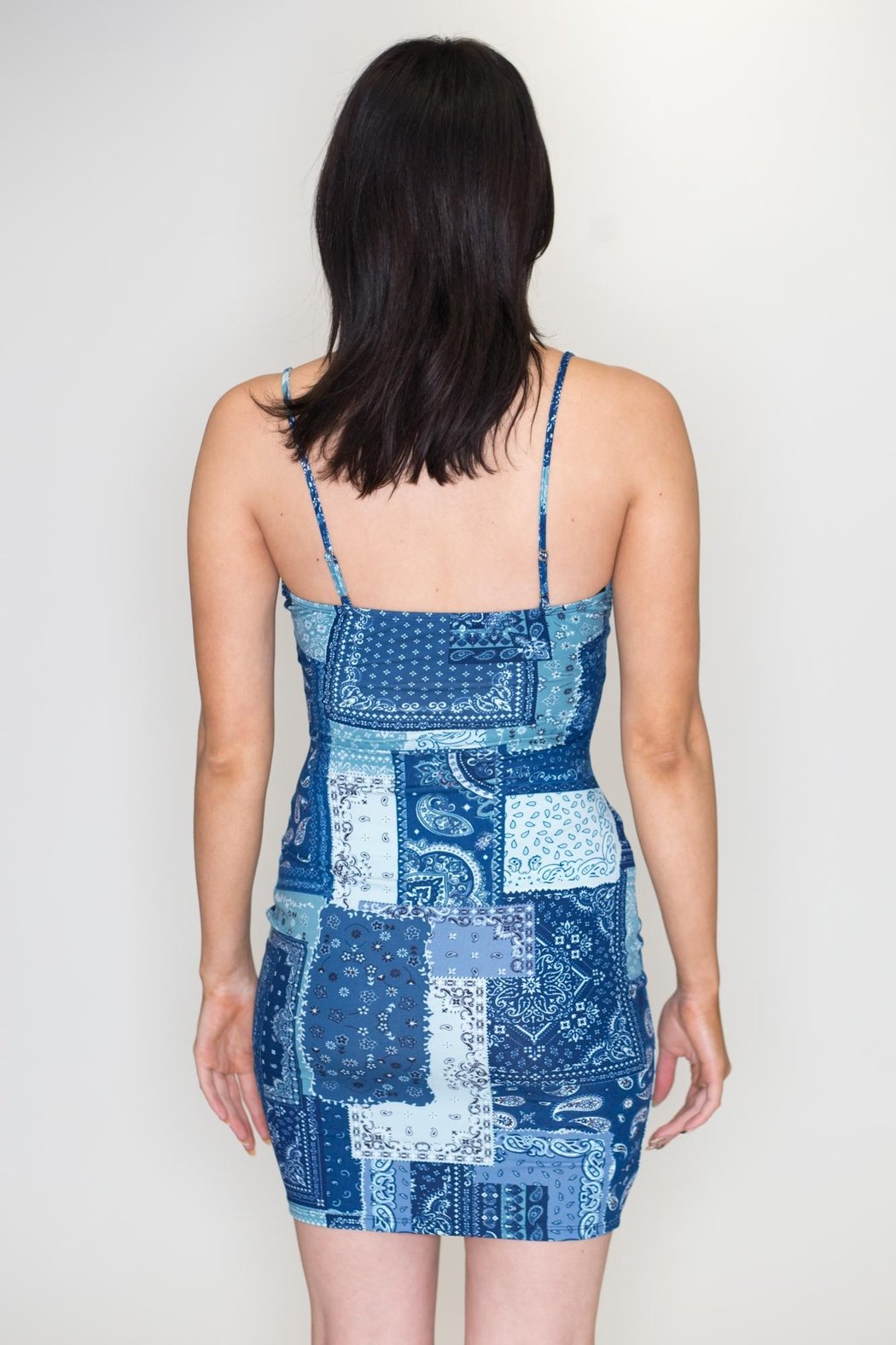 Paisley patchwork print mini dress with adjustable straps.
