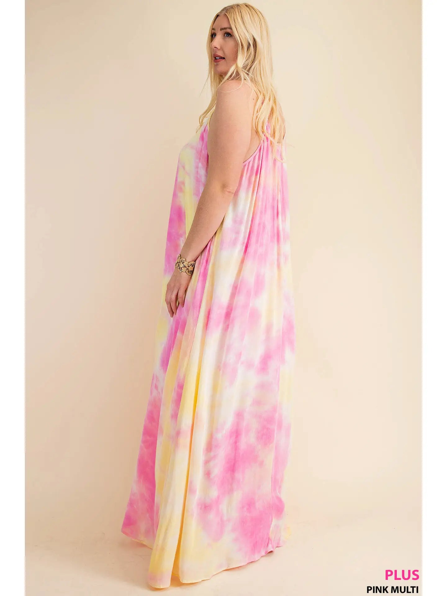 Get ready for a night out with our stunning Pink and Yellow Soft Tie-Dye Fabrication Strappy Maxi Dress. Pair it with our white denim jacket for a striking look. The bold and vibrant colors are simply breathtaking!