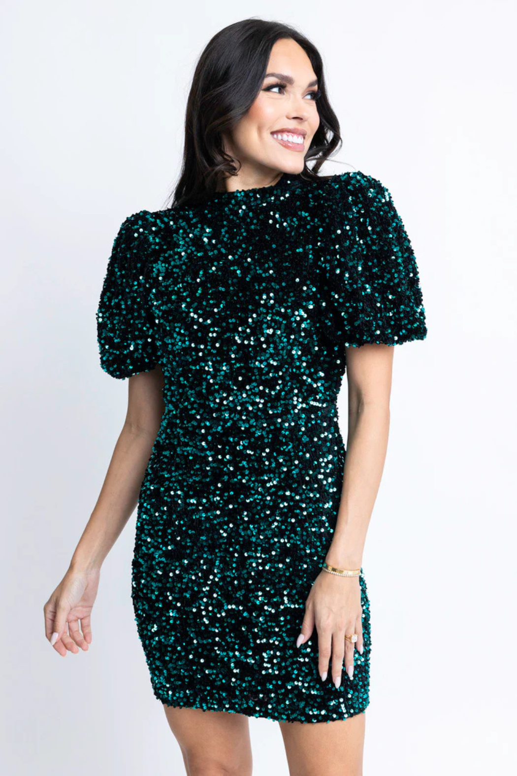Look elegant and sophisticated at your next formal event in this classy sequined dress. Featuring a fashionable puff sleeve and open back, you'll be sure to turn heads. Model is 5'3", wearing a small.