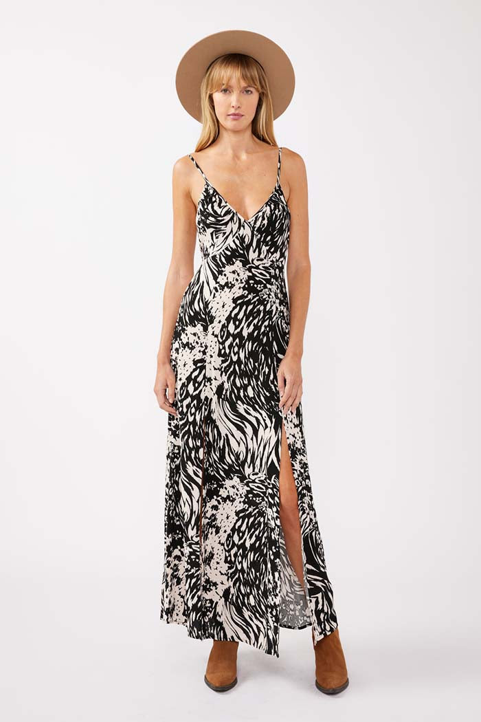 Rayon Spaghetti Strap Tie Back Maxi Dress. A Spaghetti Strap Tie Back Maxi Dress, crafted from floral/animal rayon crepe. Designed with a v-neckline, an elasticized self-tunnel at the back waist, and a stylish front slit, this dress offers a blend of comfort and chic flair. Fabric Contents 100% RAYON Made in China