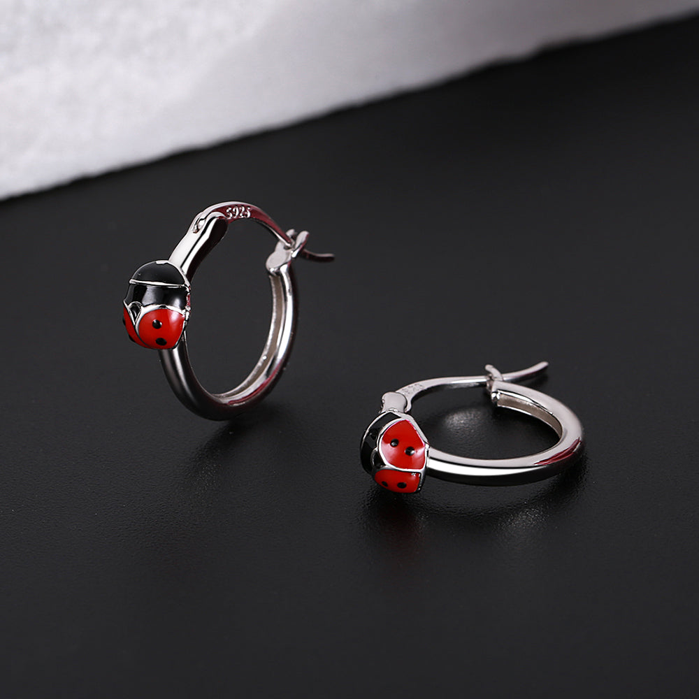 Red and Black Enam & Solid Sterling Silver Ladybug Petite Huggie Earrings