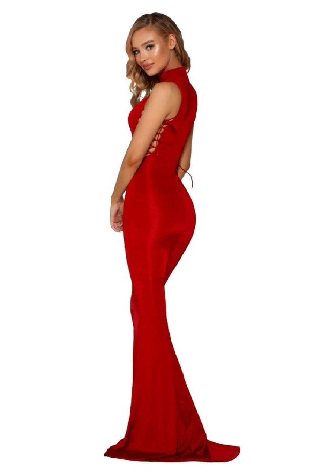 This dress features a collared neckline with a slim bodycon fit. The gown has a centre back zipper and a sexy criss cross tie up pattern on the side.
