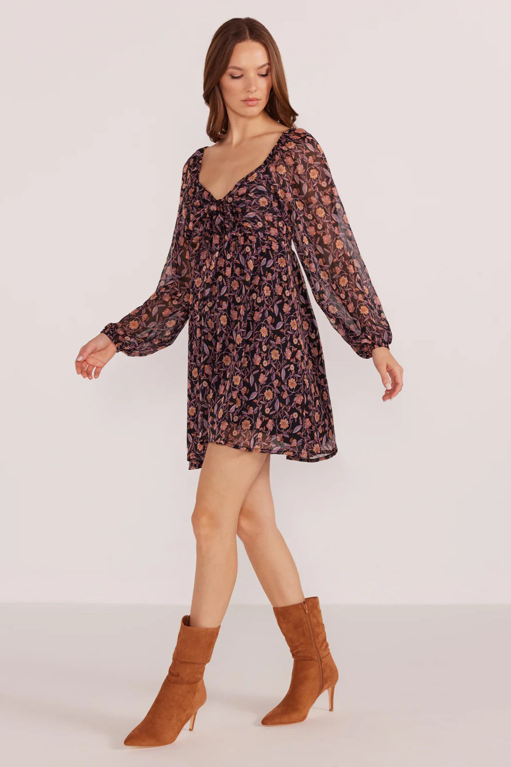 With a stunning autumn inspired floral print on a black background, this long sleeve babydoll dress features a sweetheart neckline with a bow detail. Perfect for anything from a fall wedding to a grad party or banquet, this dress will instantly become a wardrobe staple.