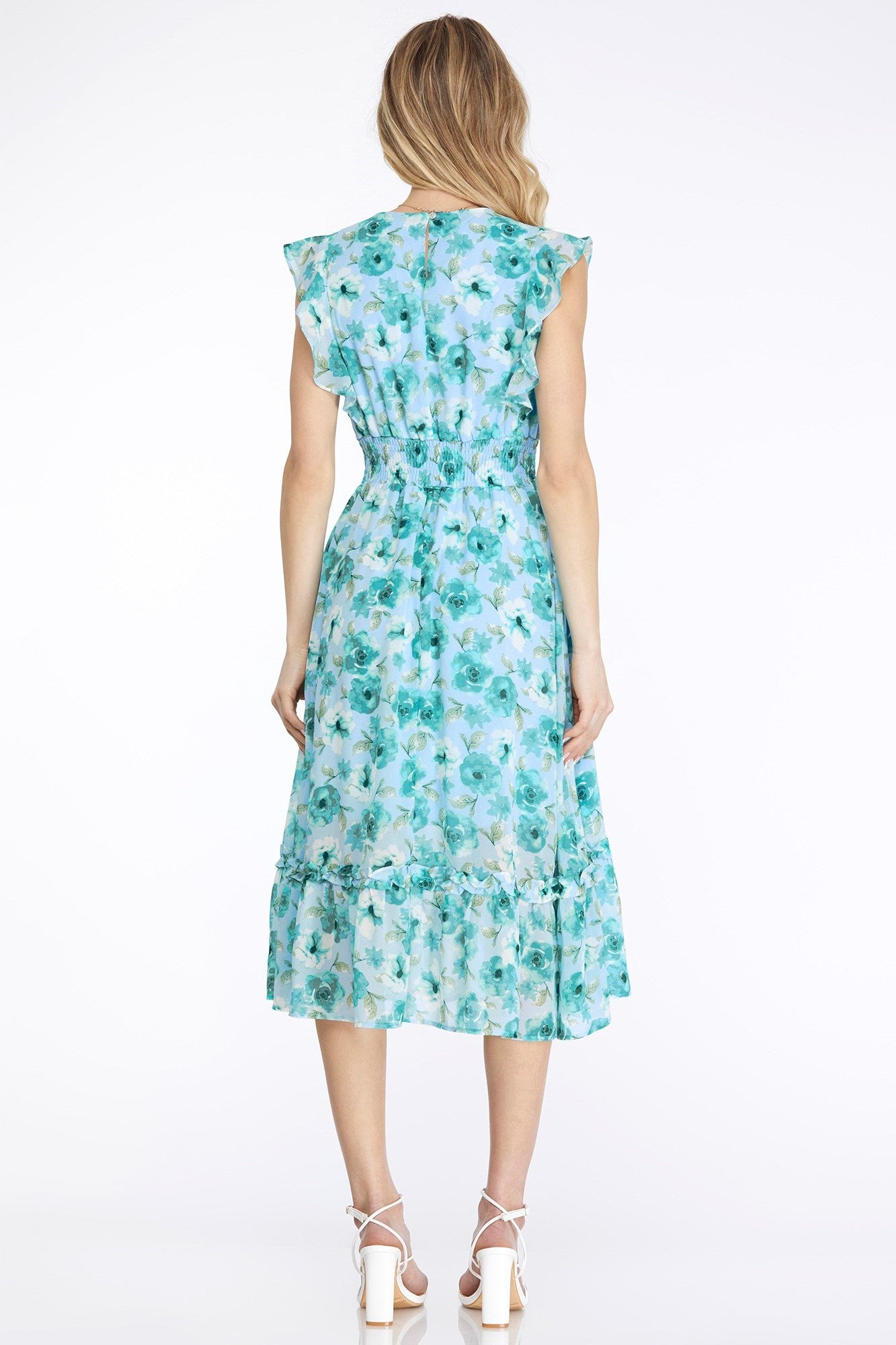 This ruffled sleeve floral print woven smocked waist midi dress is the perfect summer dress! It is a nice lightweight and flowy dress! The floral print has a mixture of blues, greens, and whites. The model is 5'8 so that can give an idea of length. The bottom tier of the dress is also sheer as the lining only goes partway down the dress. This dress also has an adorable flutter sleeve!
