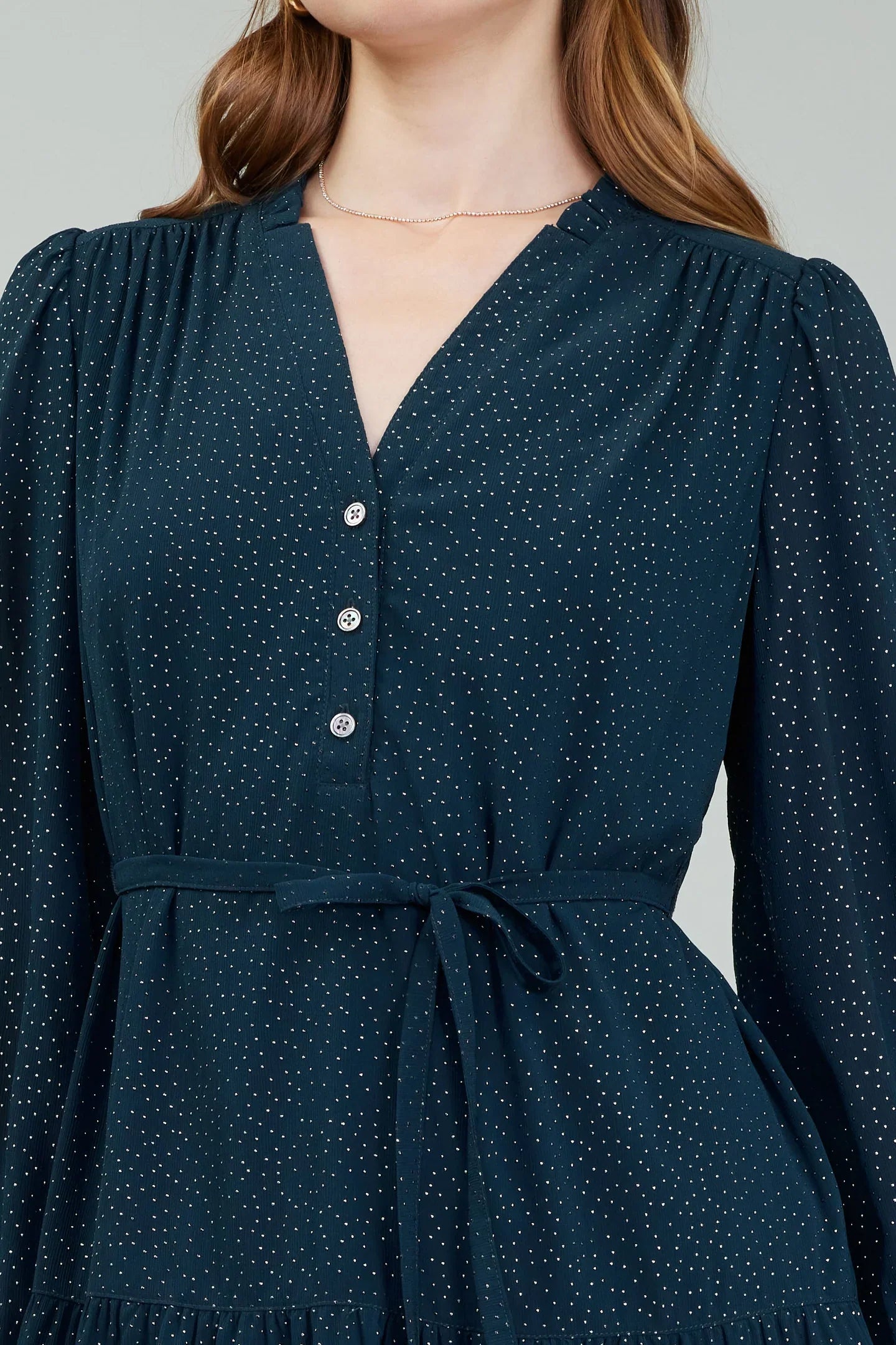 Feminine charm meets playful elegance in this deep teal mini dress. Featuring all-over studs, a flirty tiered skirt, and ruffle details, it offers effortless style. The split neckline, buttoned front, and optional self-tie belt add versatility, while long sleeves provide a touch of sophistication. Details: - Split Neckline with Button Front - Long Sleeves - Optional Self-Tie Belt - Tiered Skirt with Ruffled Hem - Studded Detailing Perfect for day-to-night chic.