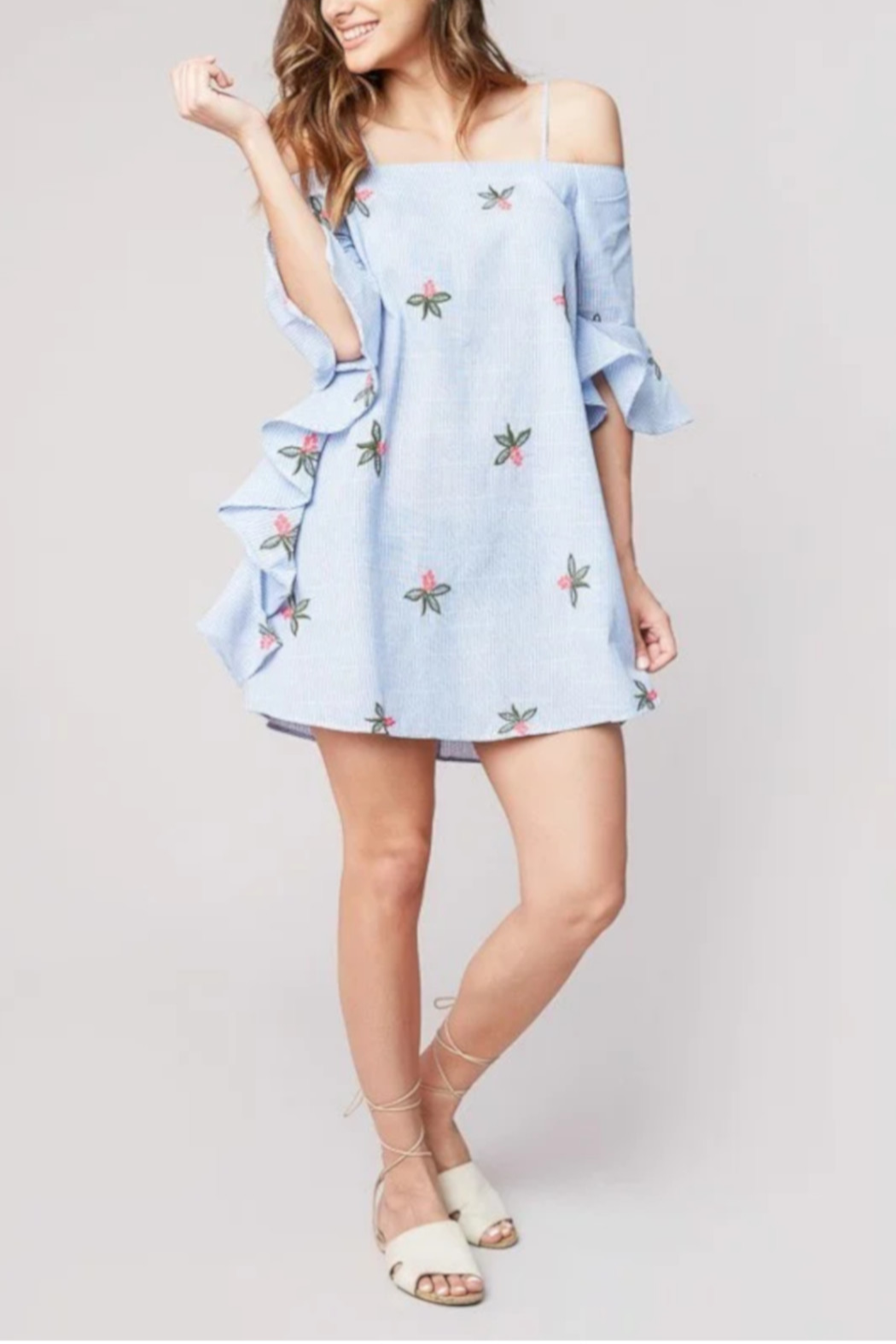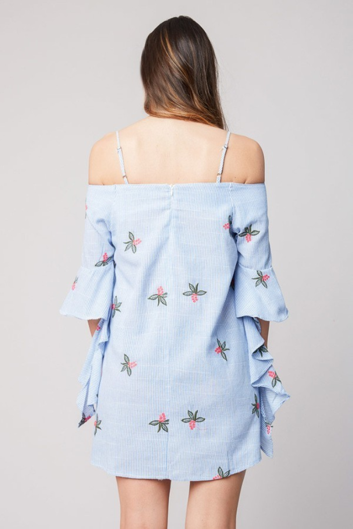 An Spring dress that you can not miss! This adorable feather weight dress features light blue pin stripes all over with floral details enhancing the beautiful look, a shift style for easy breezy comfort, off the shoulder style with adjustable shoulder straps and short sleeves with ruffle details, unlined, material has little stretch. The perfect outfit for your Spring and Summer attire. Wear it with a pair of woven sandals and cross shoulder bag for a nice outfit. Model wears size Small L: 32" B: 36" H: 42"