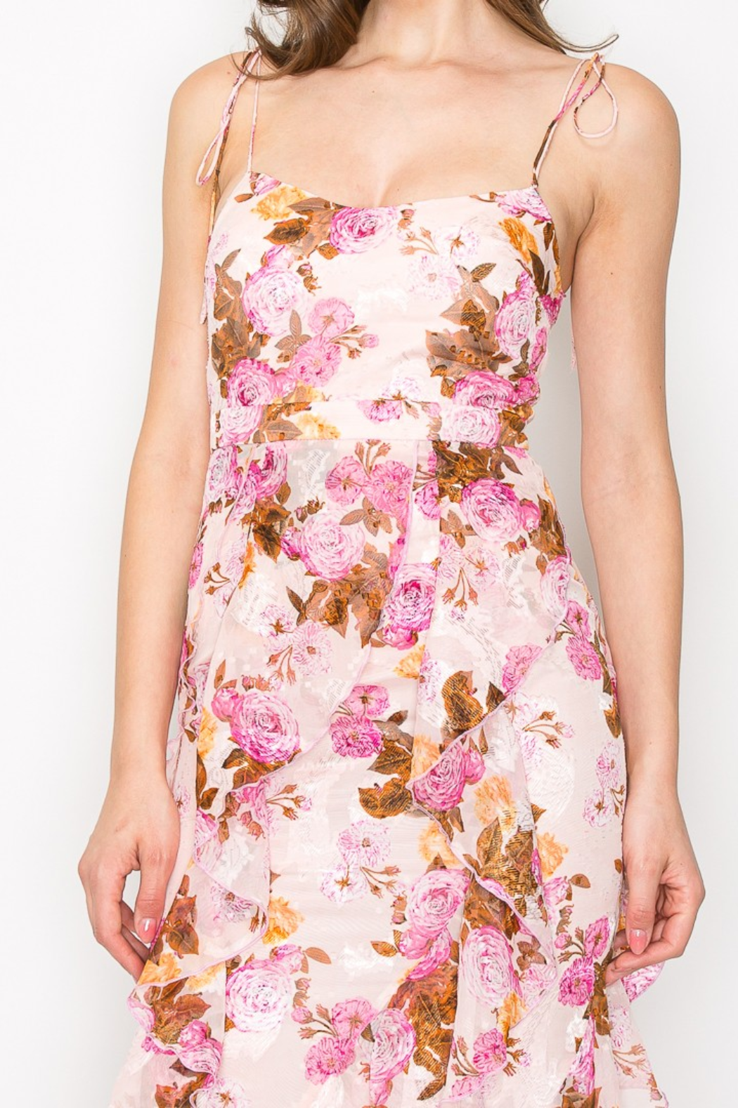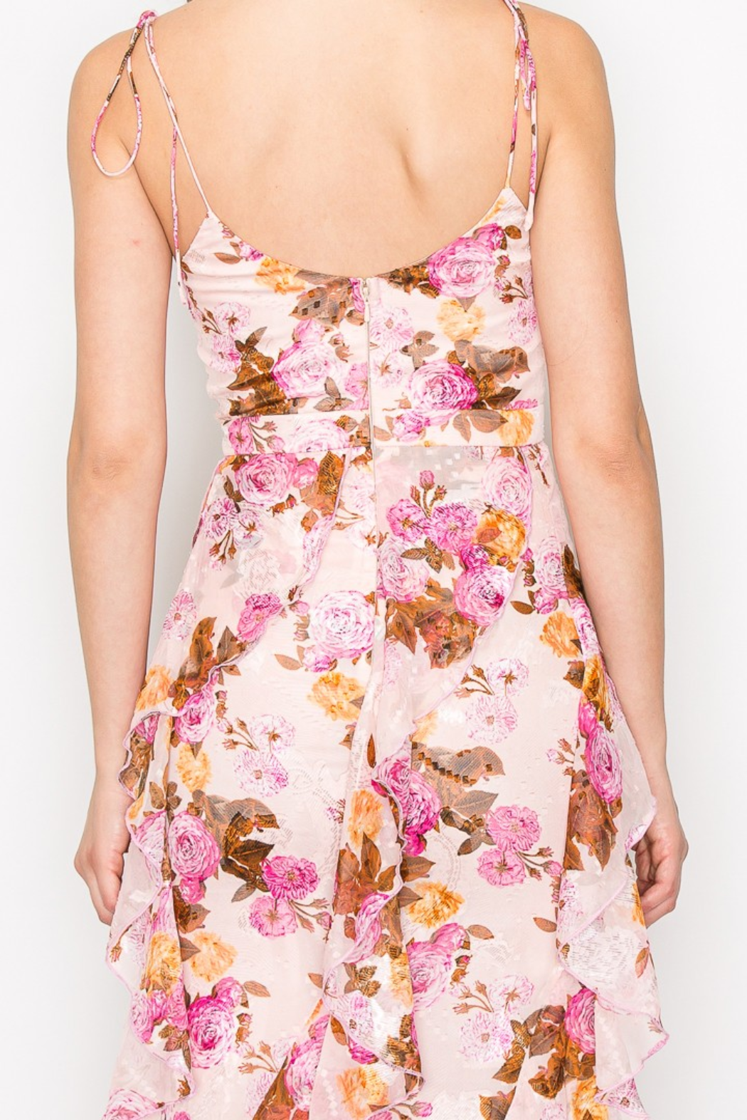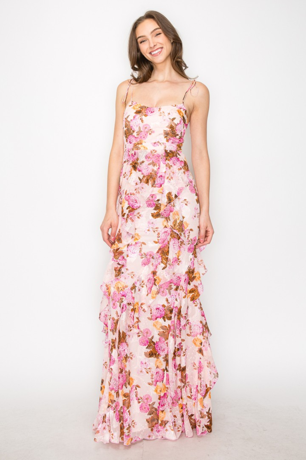 TIE STRAPS FLORAL SIDE RUFFLE TIERED MAXI DRESS