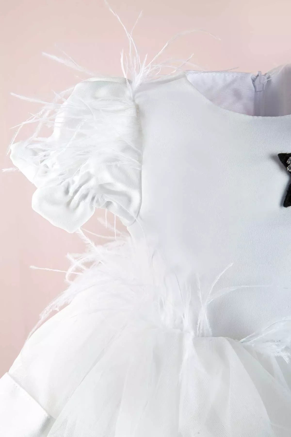 - White ostrich feathers on the skirt from front to back